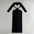 Black Color Women Long Sleeve Shinnign Crystal Waist Mesh Bodycon Bandage Long Dress Nightclub Party Celebrate Evening Dress