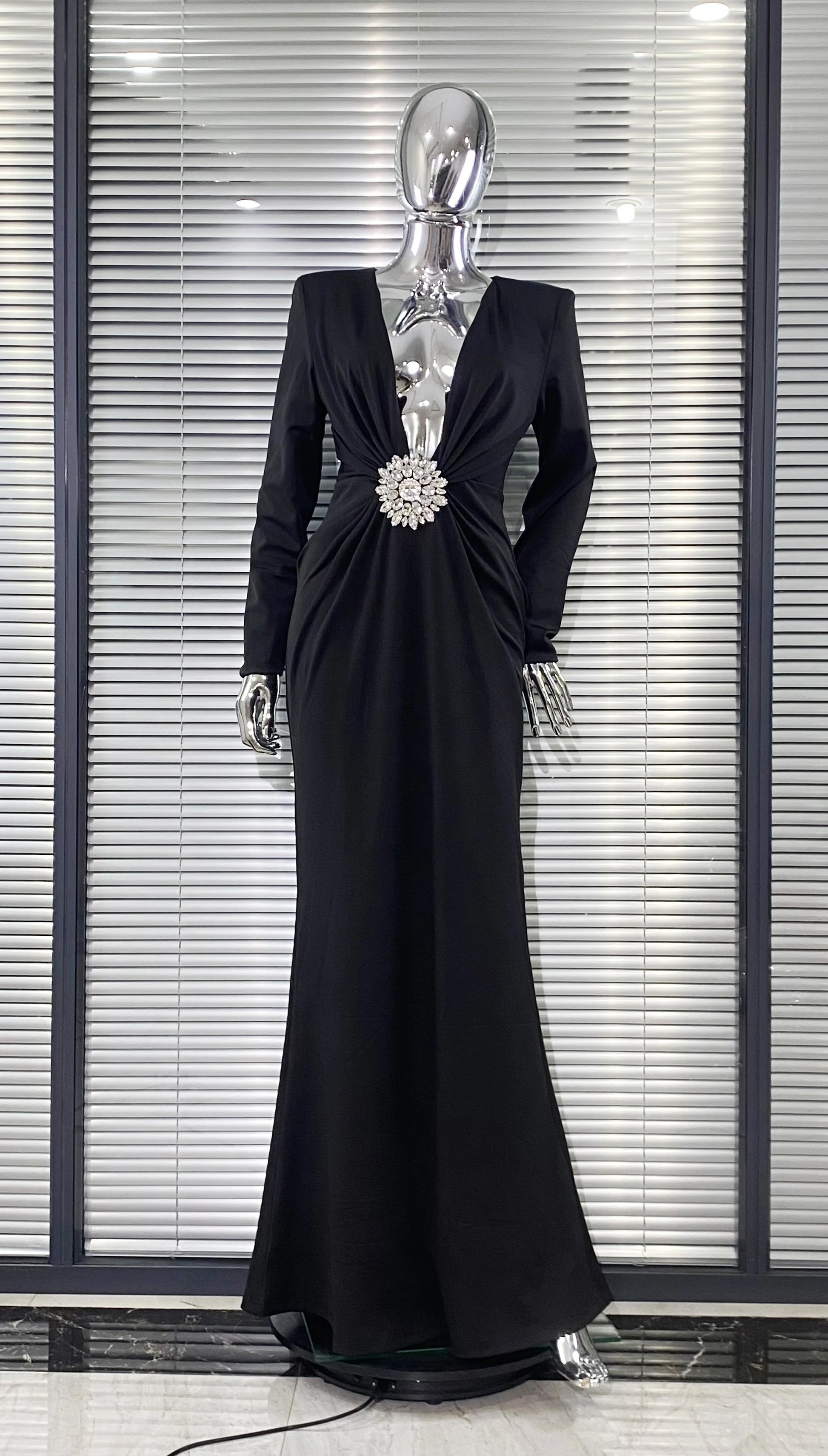 Black Red White Women Long Sleeve Sexy Deep V-Neck Bodycon Long Dress Elegant Evening Party Celebrate Birthday Outfit Vestido