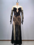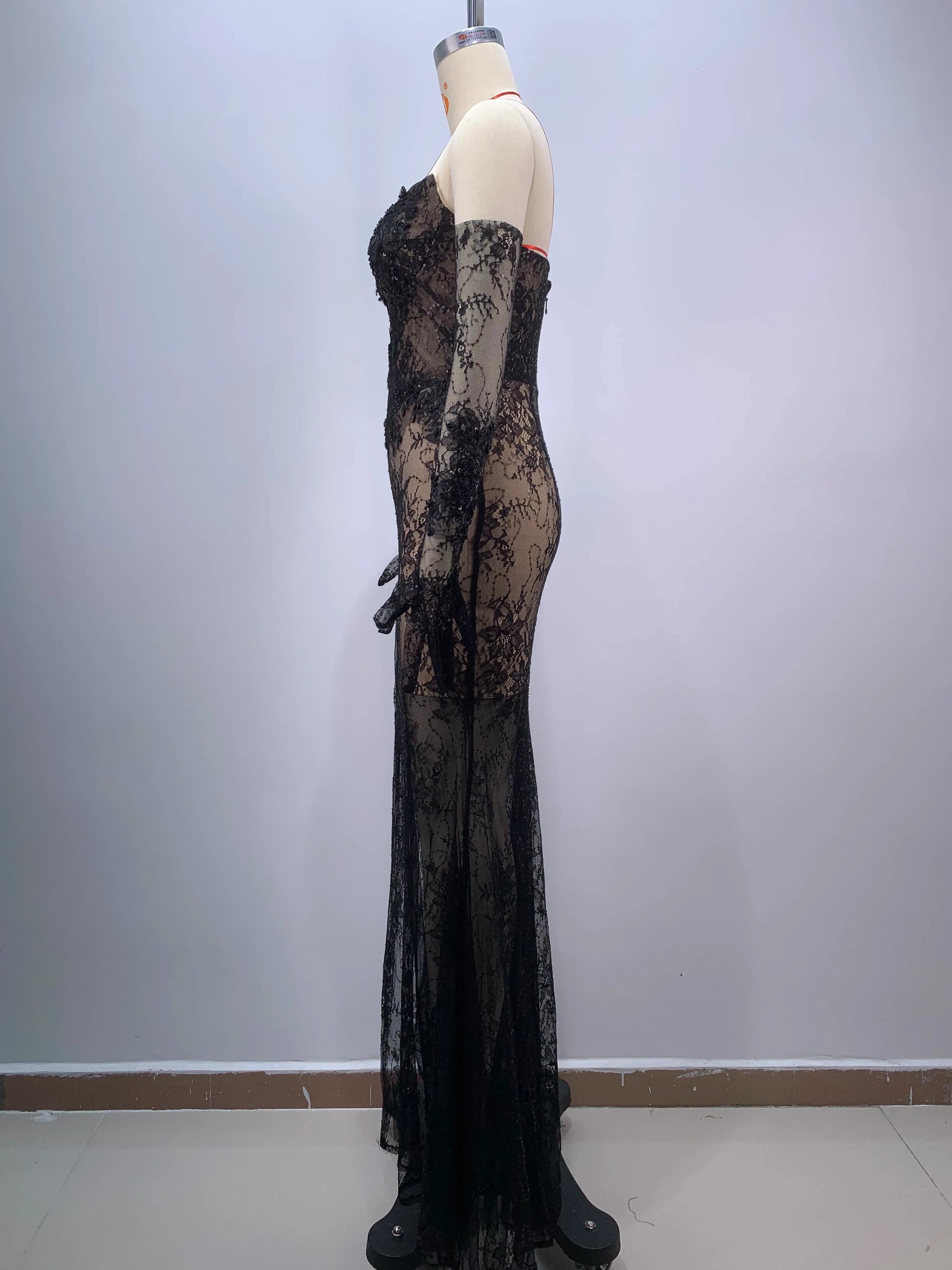 Fashion Gloves Sexy Mesh See Through Black Lace Strapless Midi Calf Dress Birthday Party Evening Dress Celebrity Party Dress