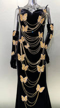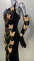 Fashionable Gloves Gold Shining Diamond Butterfly Strapless Black Long Dress Celebrity Luxury Evening Dress Performance costume