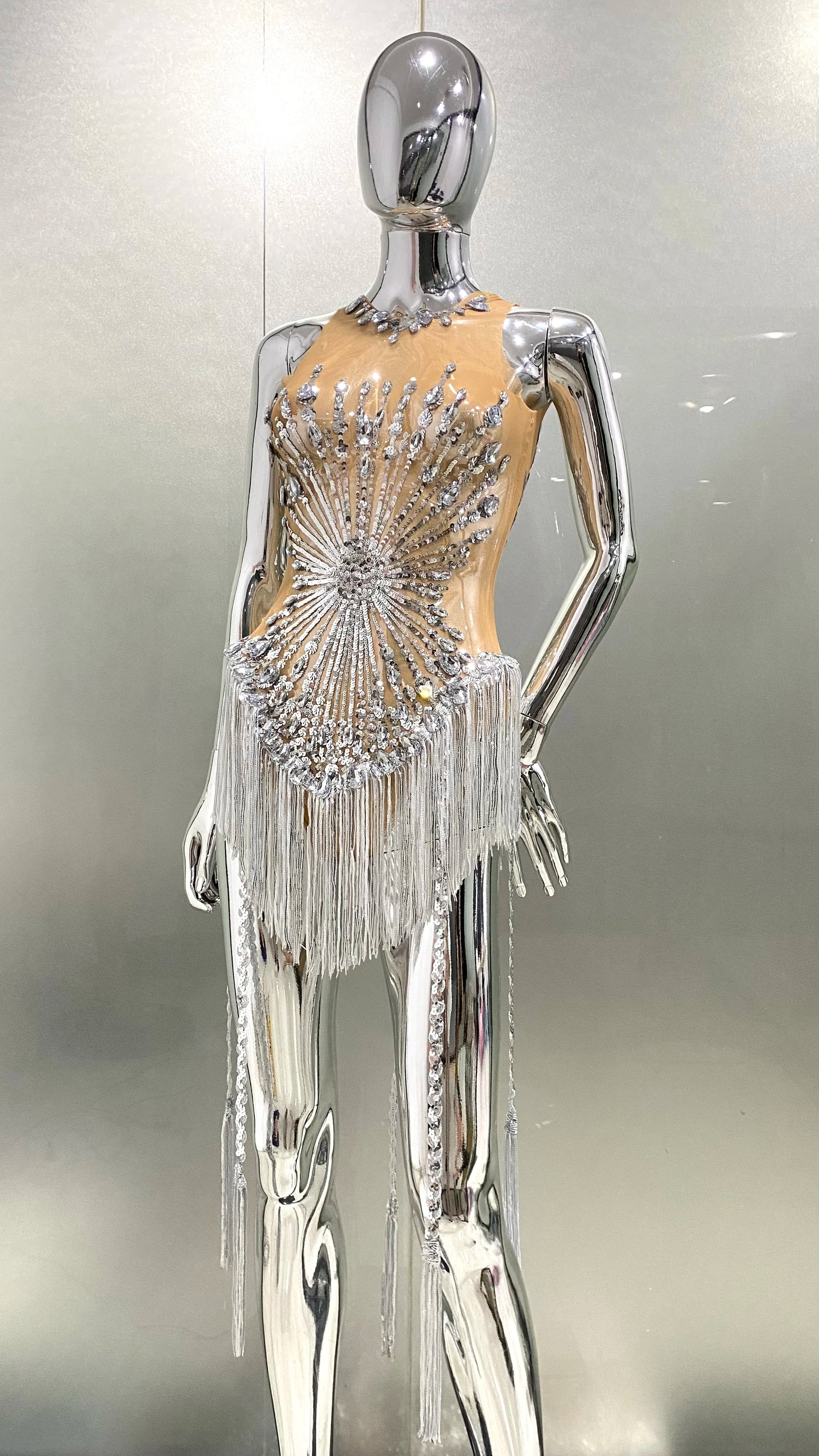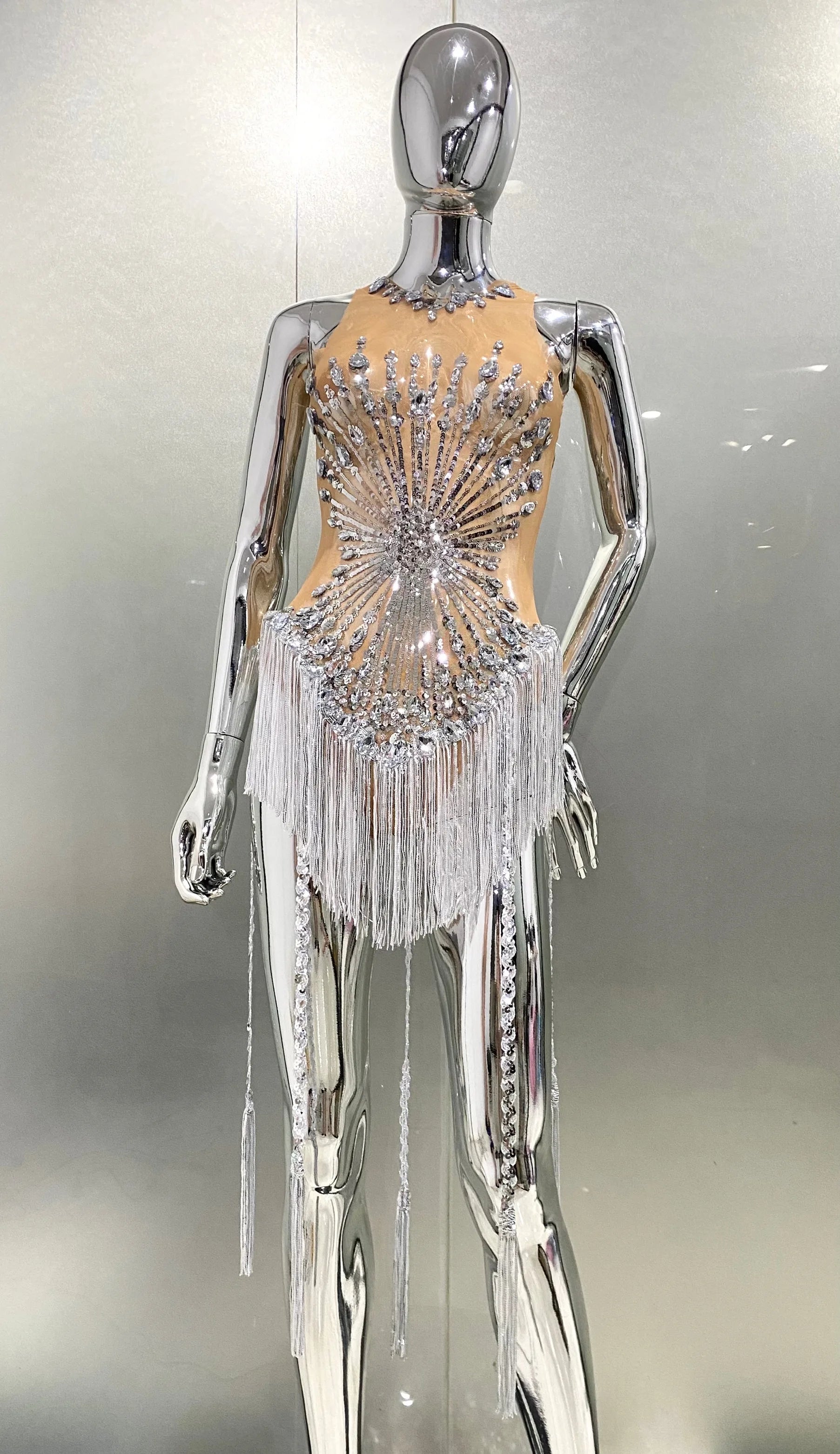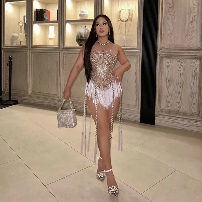 Women Sexy Mesh Shinning Sequins Tassel Bodycon Bodysuit Nightclub Party Birthday Performance Costume Stage Wear