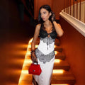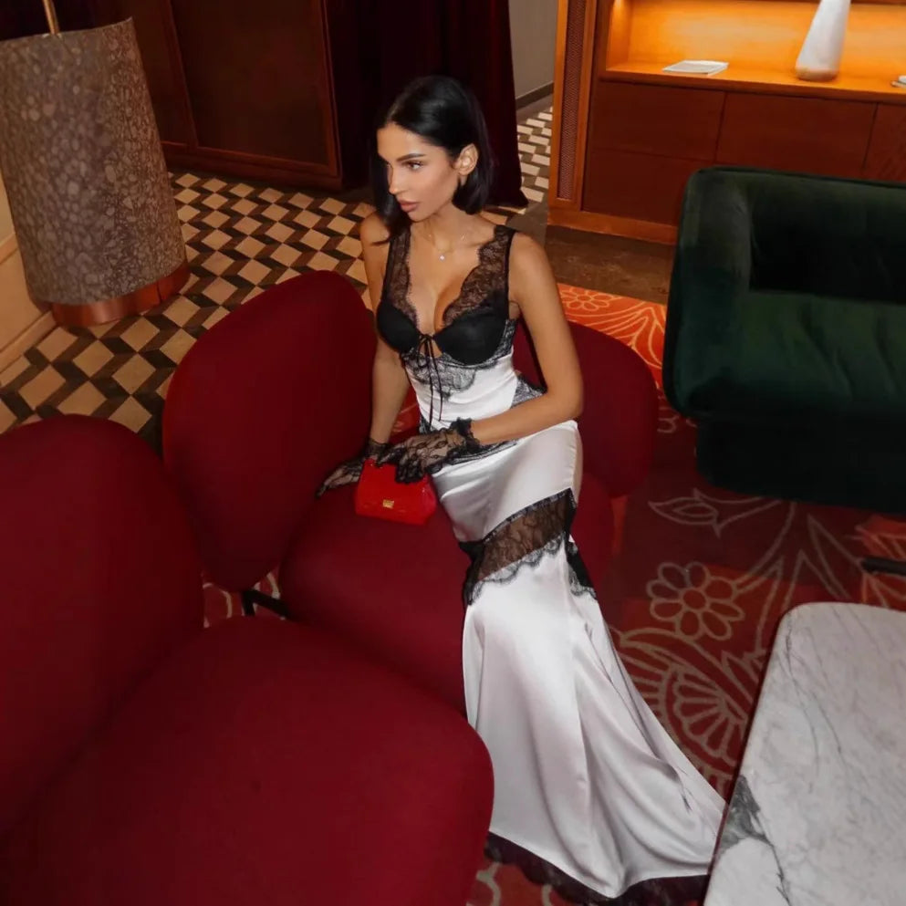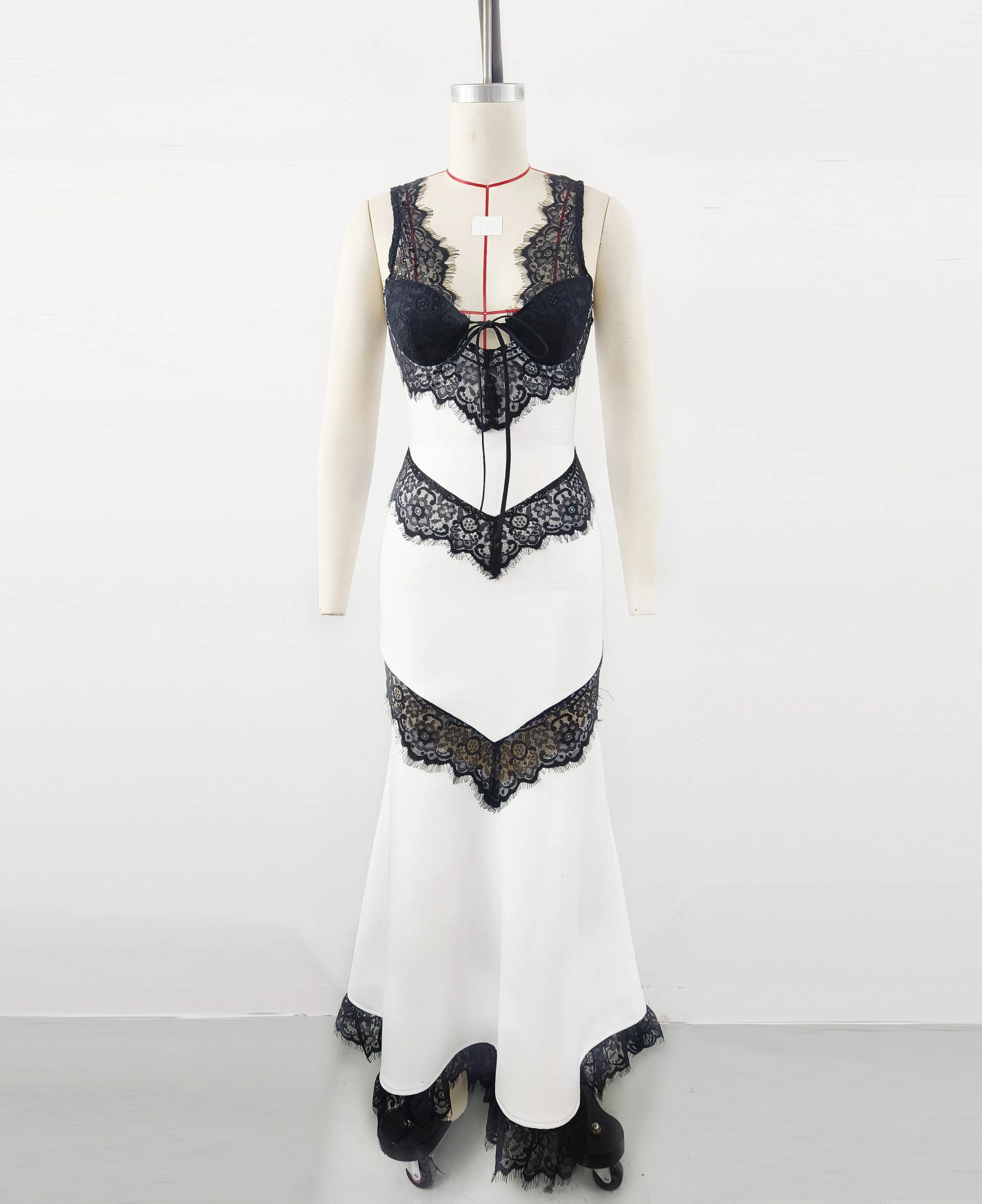 Women Sleeveless V-Neck Sexy Black Lace Bodycon Bandage Long Dress Evening Party Celebrate Birthday Outfit