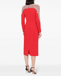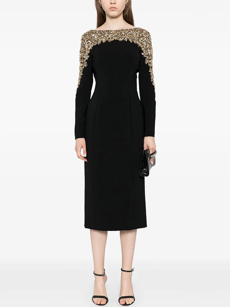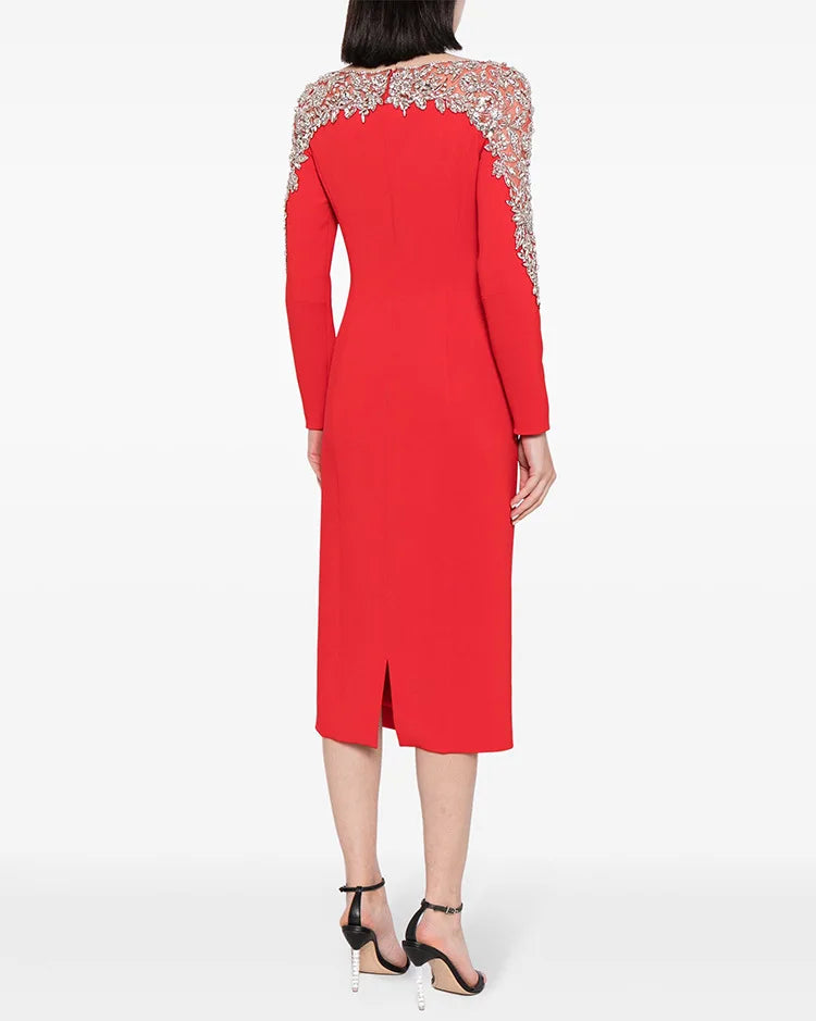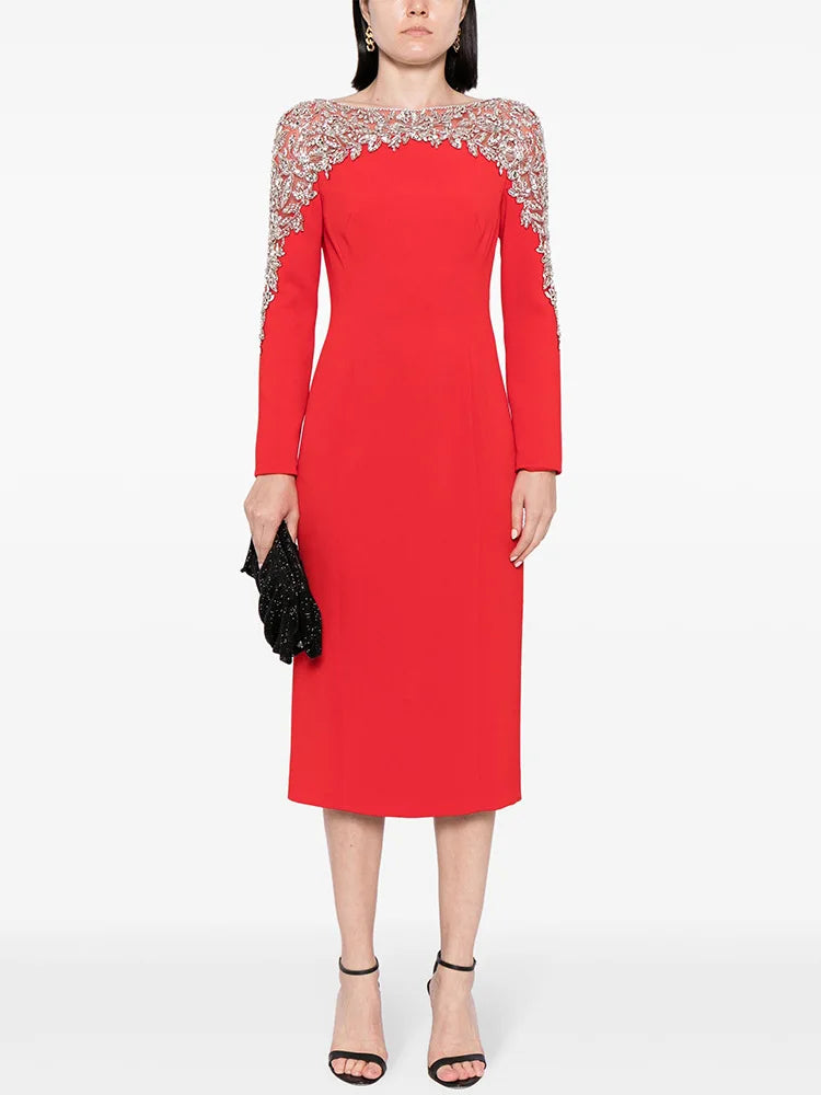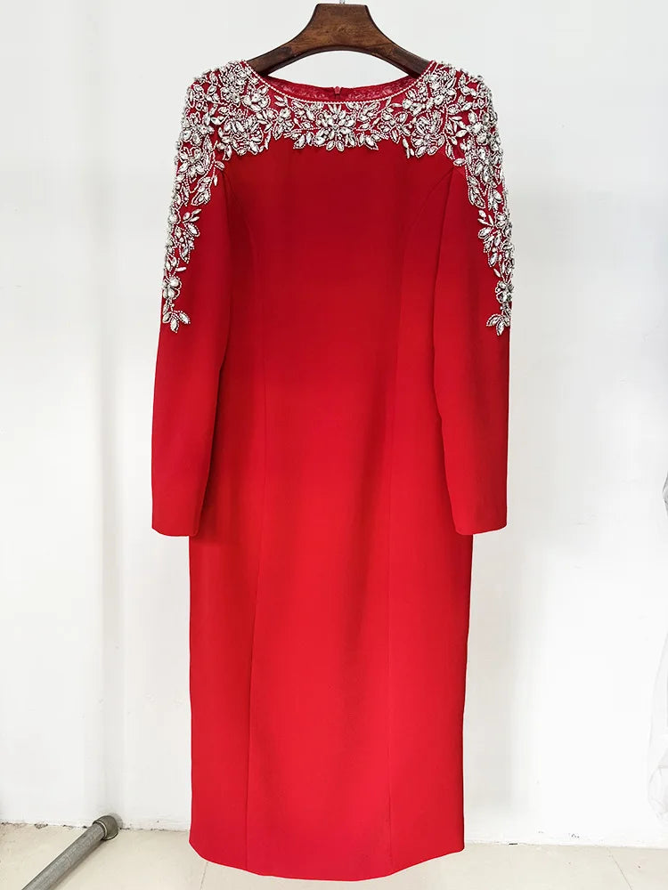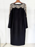 Luxury Black Red Color Women Long Sleeve Beading Handmake Slim Mid-calf Dress Elegant Evening Party Cocktail Outfit Vestido
