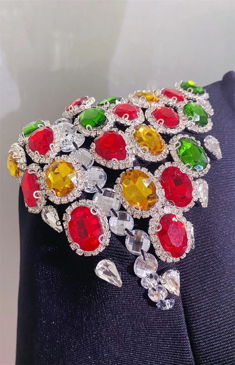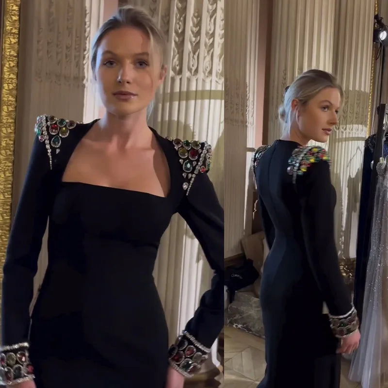 Luxury Colorful Diamonds Sexy Square Collar Black Bandage Dress Fashion Woman Evening dress Celebrity Cocktail Party Outfit