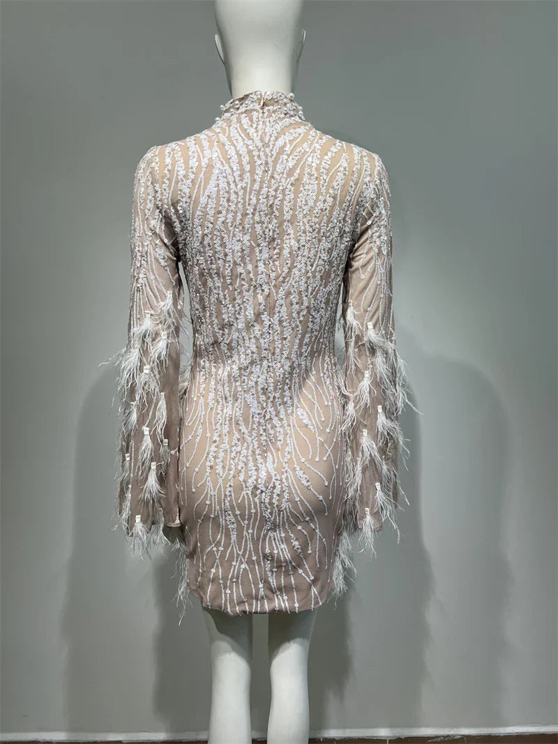 Luxury Exquisite Beading Sequins Feathers Sleeve White Mini Evening Dress Woman Birthday Party Dress Performances Costume