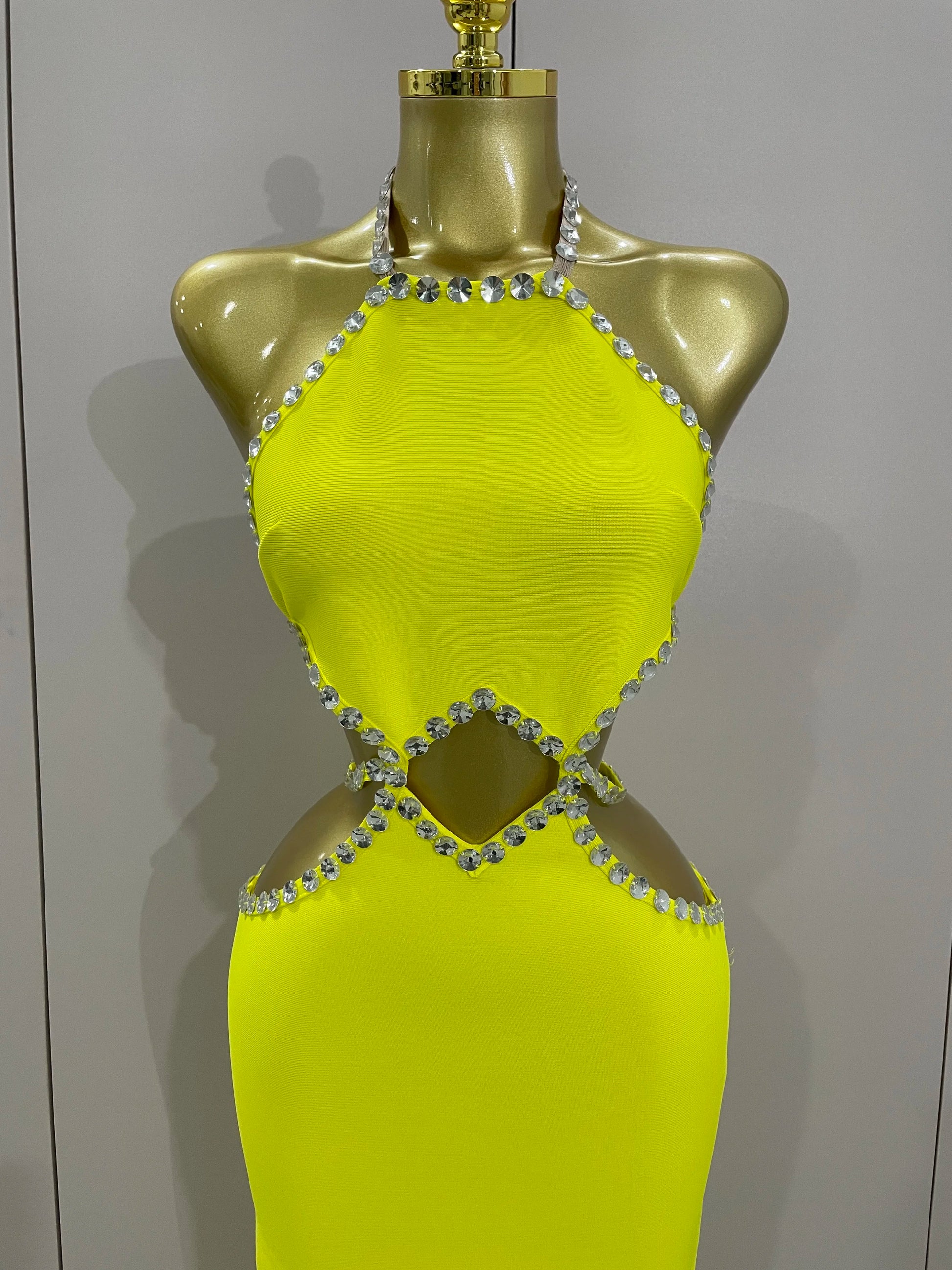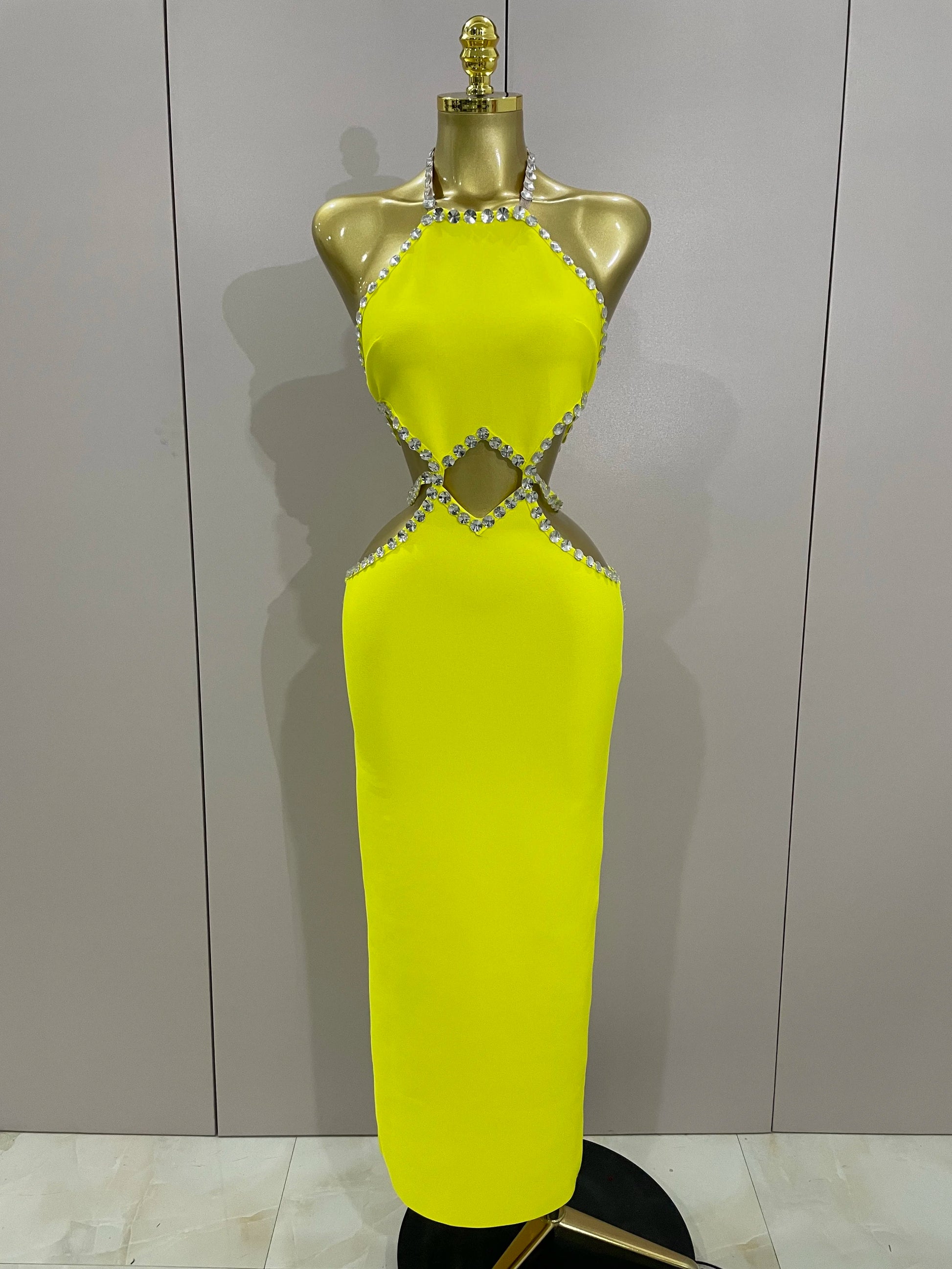 Luxury Sexy Backless Halter Beading Maxi Long Lemon Yellow Bandage Dress 2025 Women Elegant Evening Club Birthday Party Dress