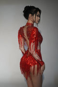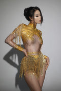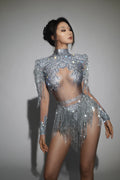 Sparkly Rhinestone Sequin Tassel Stretch Bodysuits Women Birthday Party Nightclub Dj Stage Performance Costume