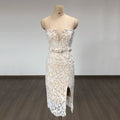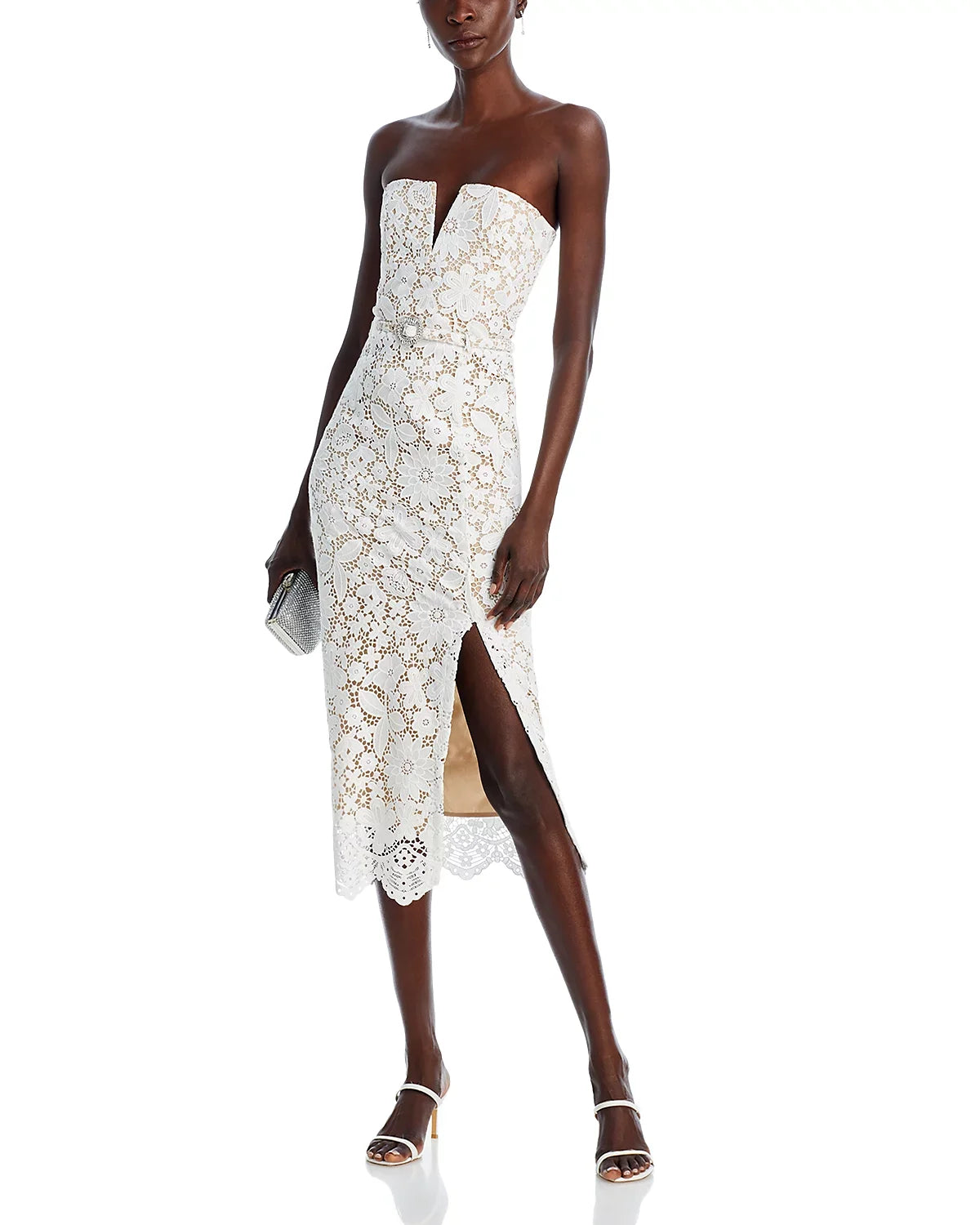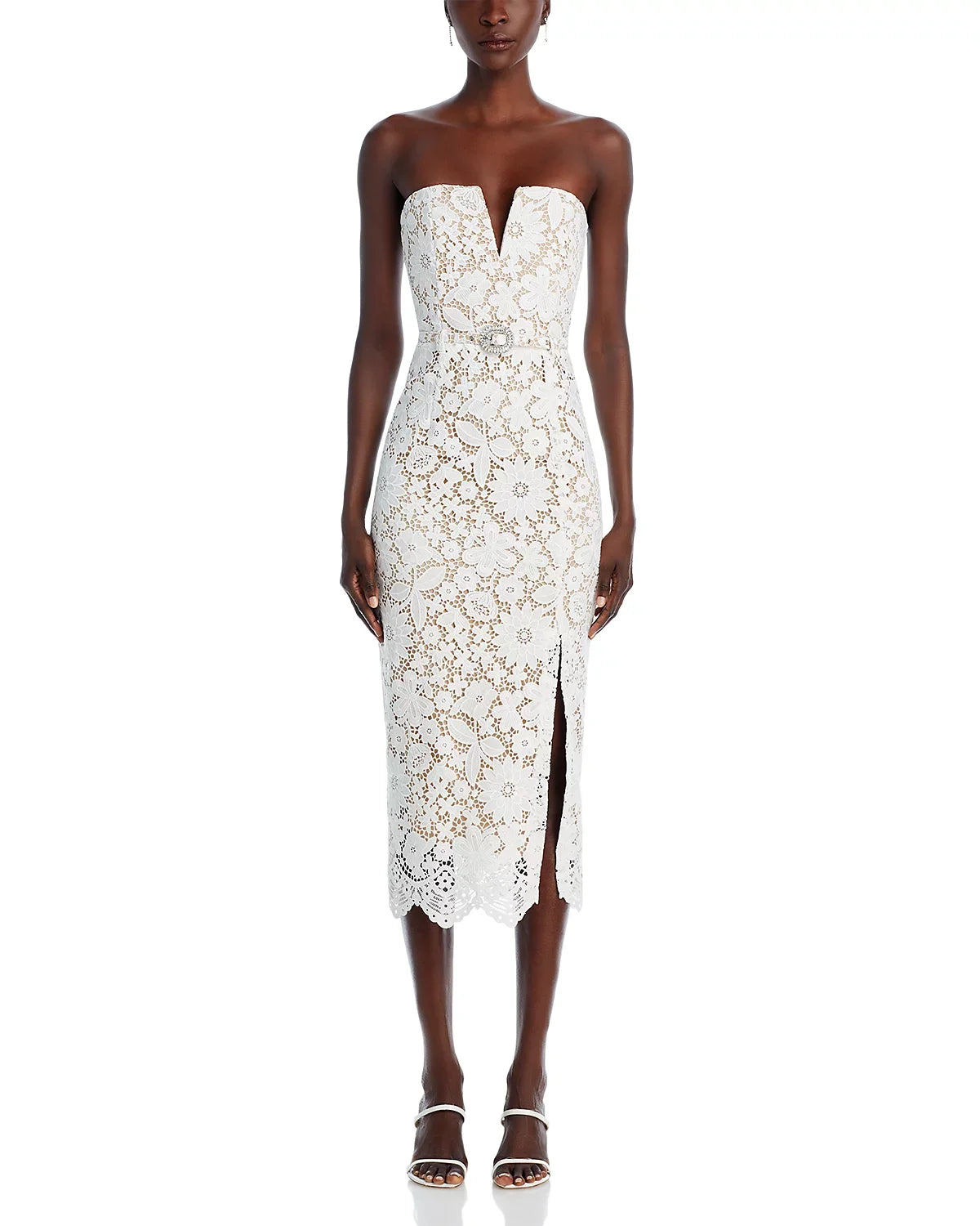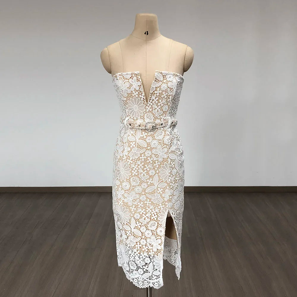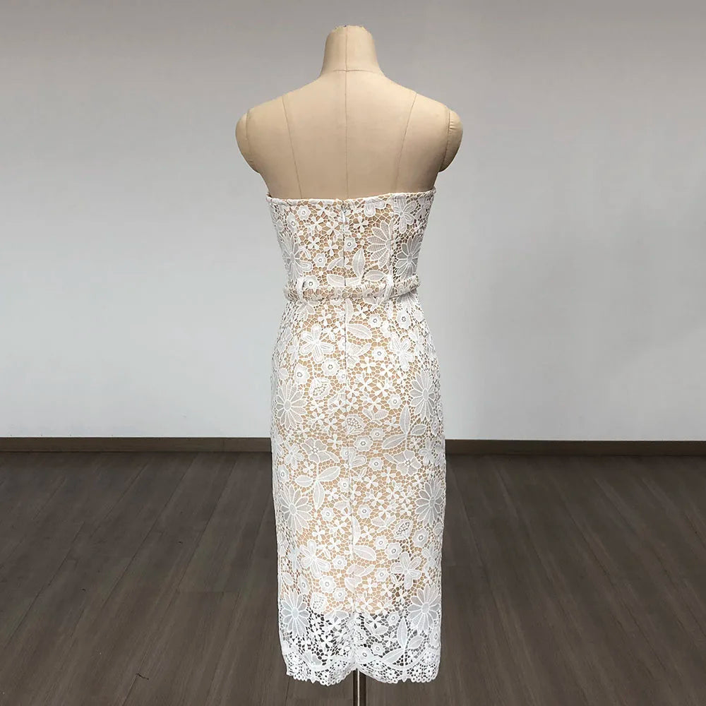 Women Sexy Strapless Lace Bodycon Mid-calf Dress Belt Fashion Birthday Party Celebrate Evening Cocktail Dress