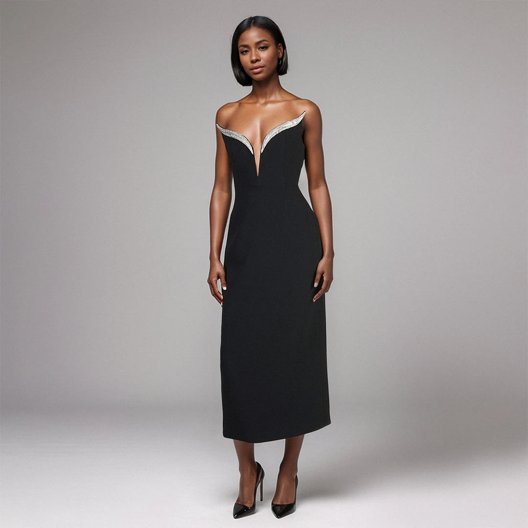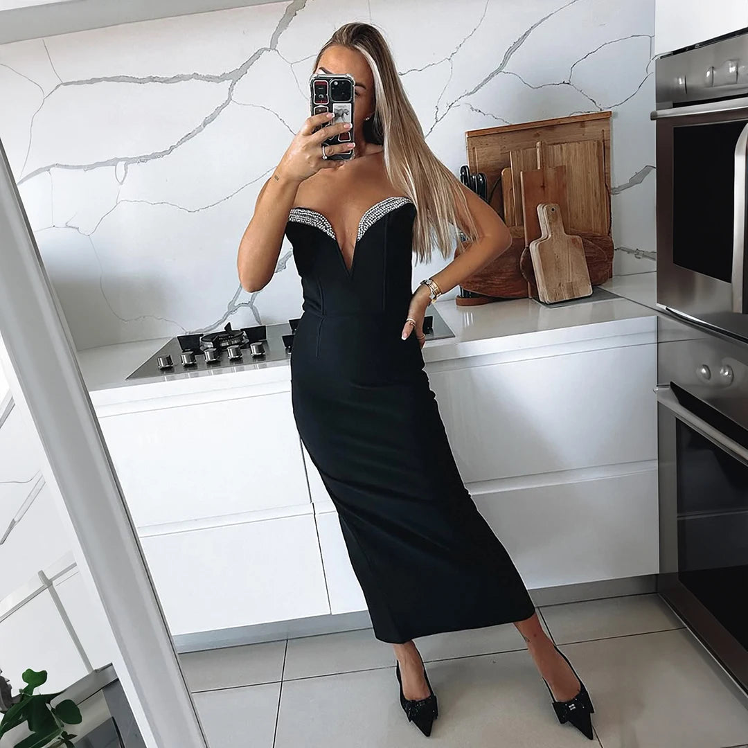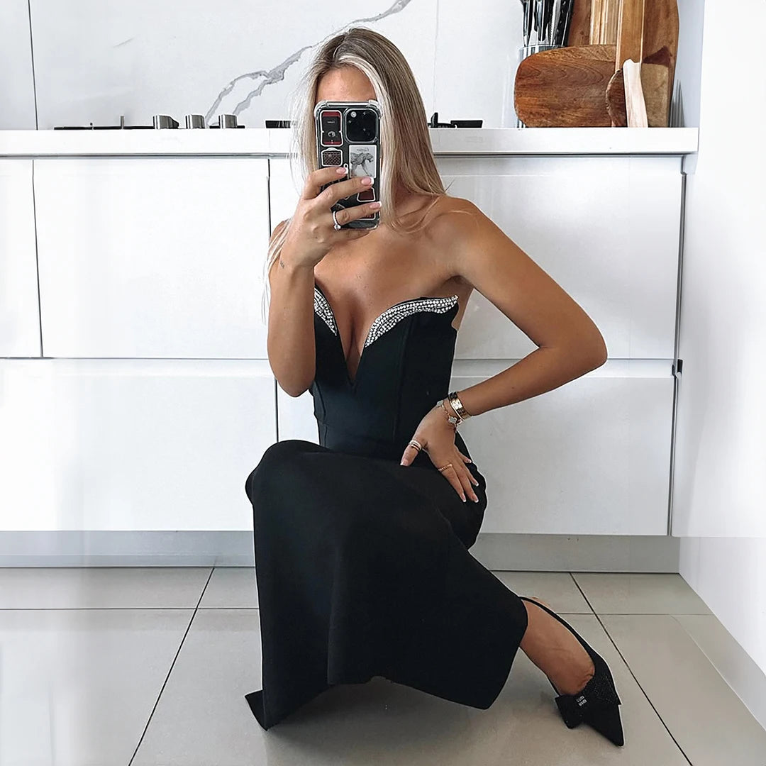 Women Sleeveless Sexy Strapless Shinning Diamond Bodycon Bandage Long Dress Celebrity Evenign Party Red Carpet Dress