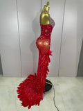 New Exquisite Feather Red Evening Dress Women Sparkle Rhinestones Sexy High Slit Birthday Celebrate Stage Photoshoot Costume