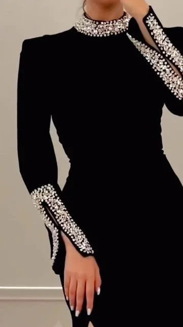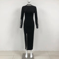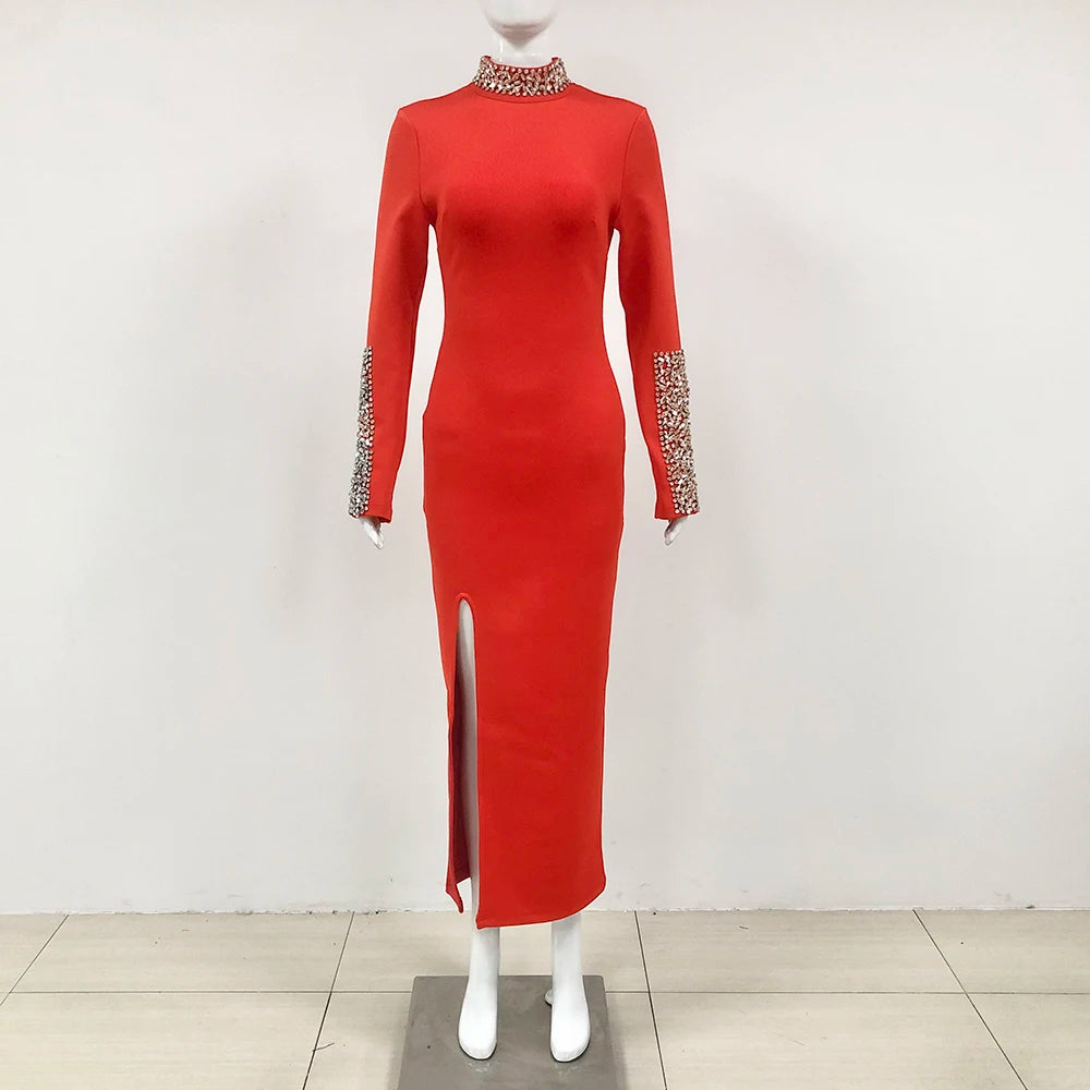 Red Black Color Women Long Sleeve Shinning Crystal Bodycon Long Bandage Dress Elegant Celebrate Evening Party Cocktail Dress