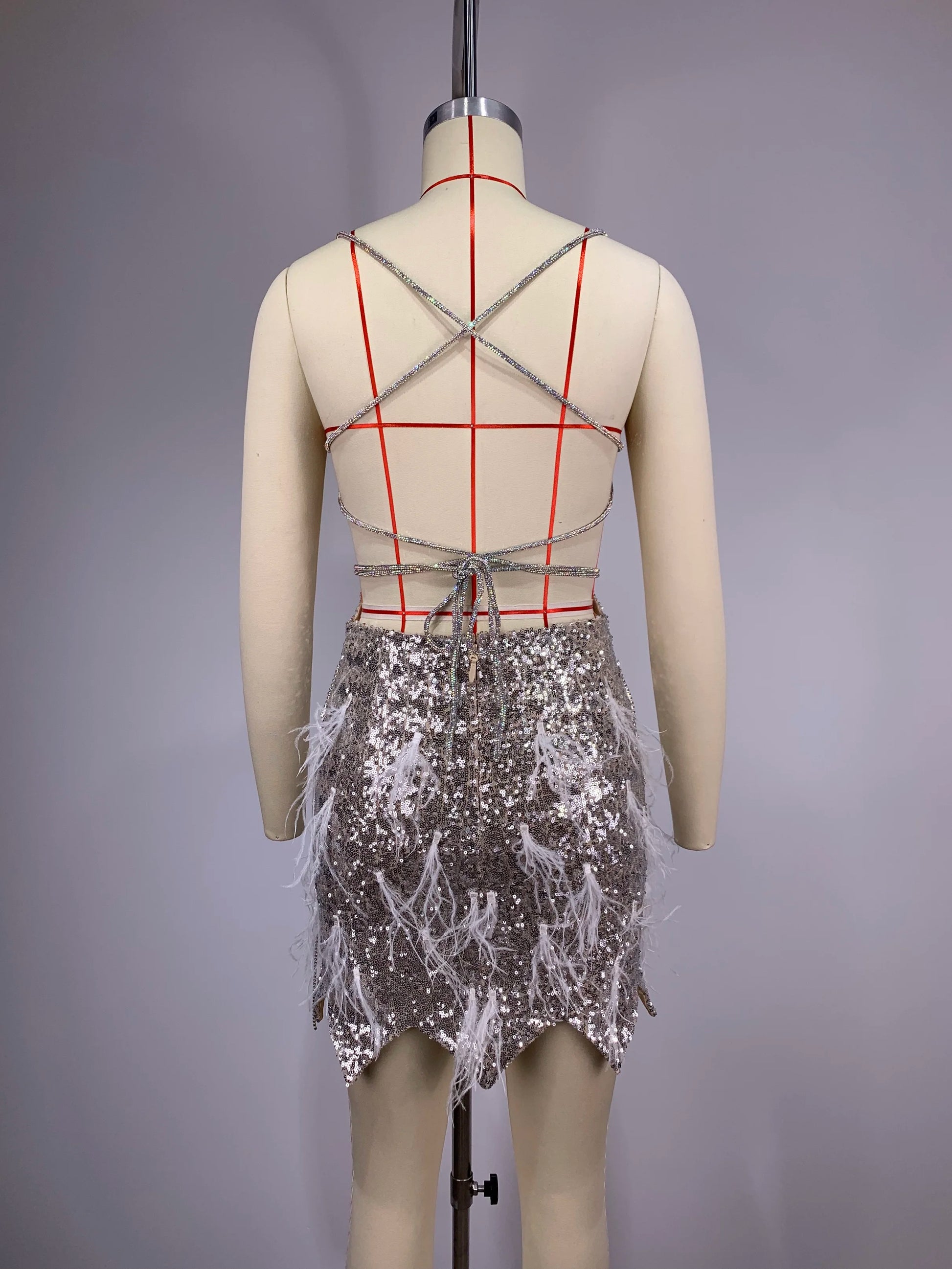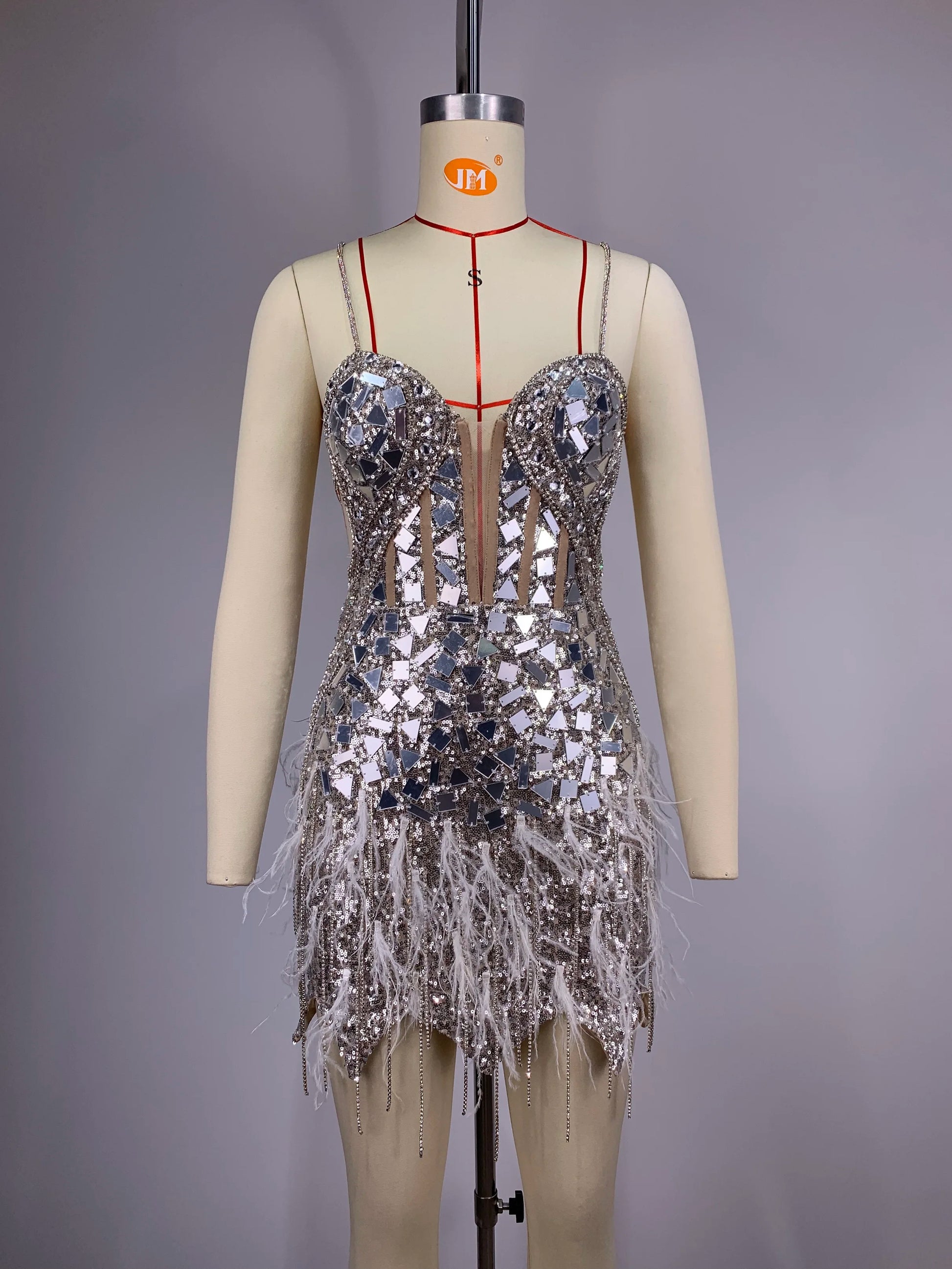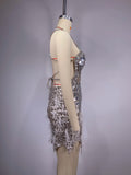 Sliver Sequins Diamonds Tassel Sexy V-Neck Strapless Mini Evening Dress Woman Birthday Party Outfit Stage Performance Costume