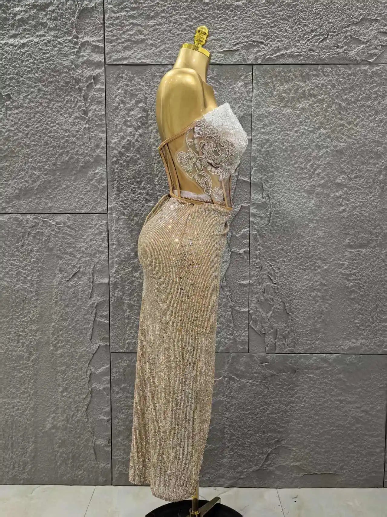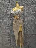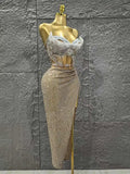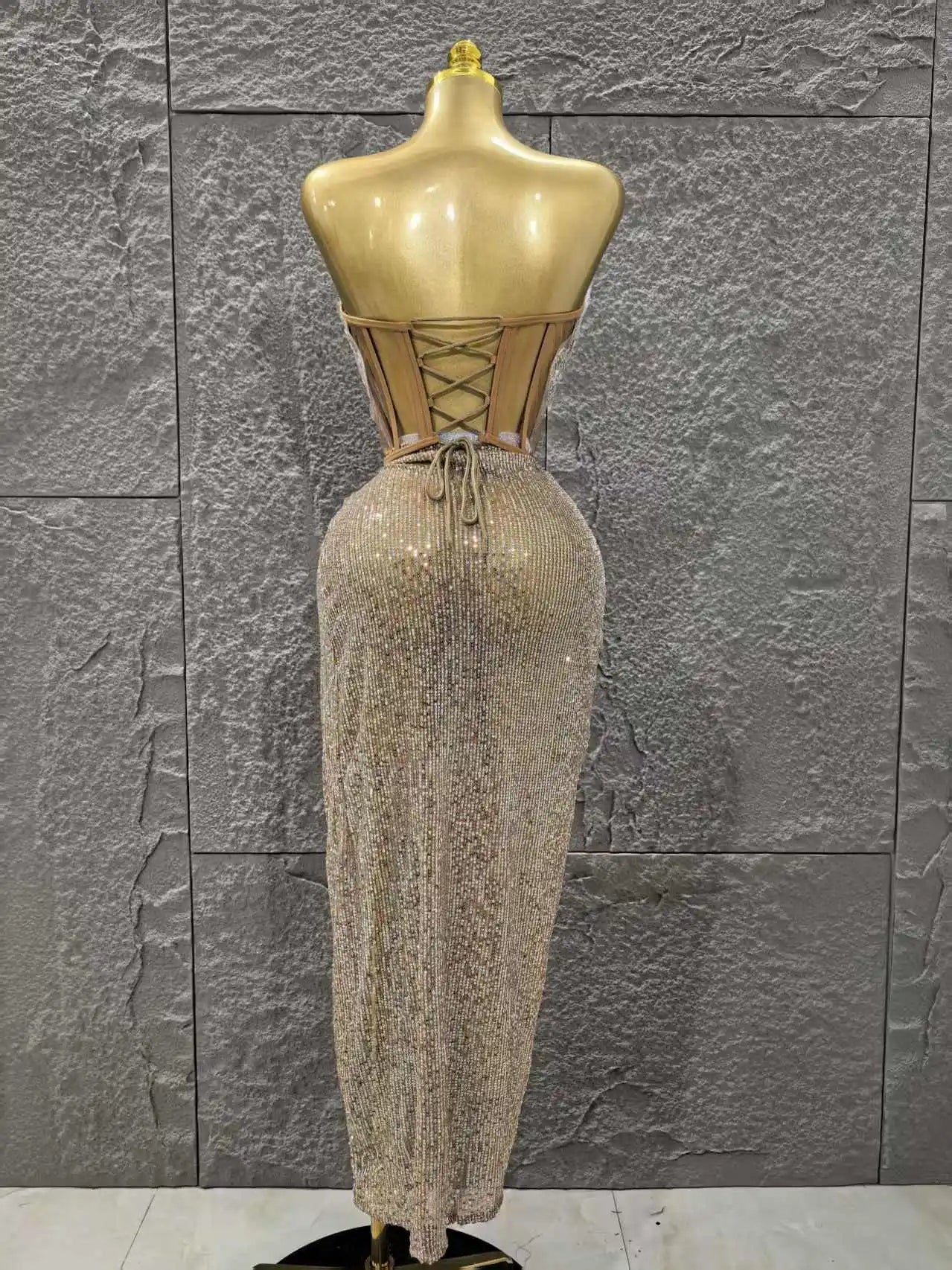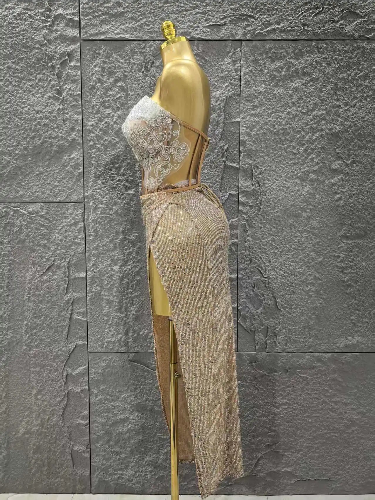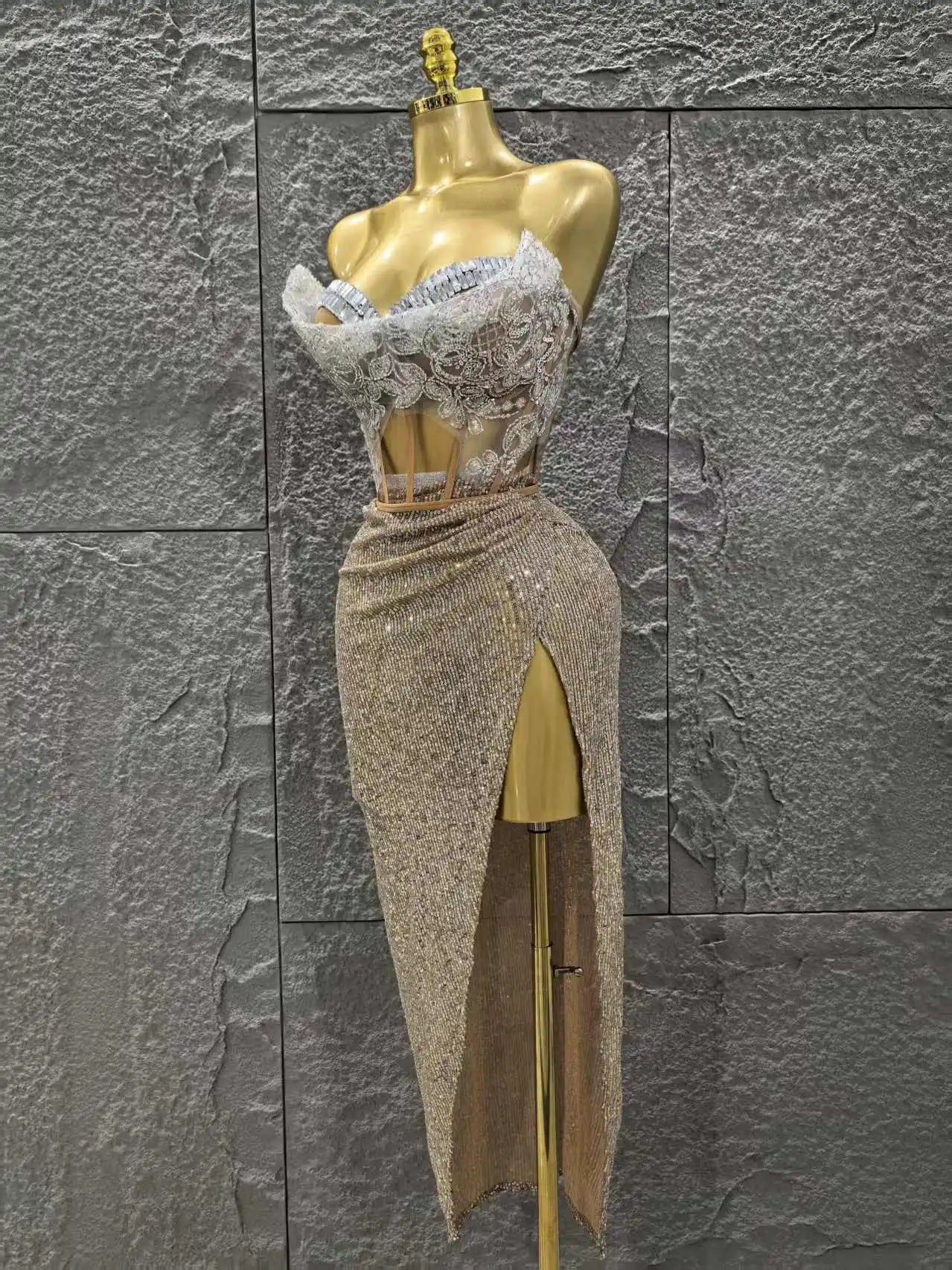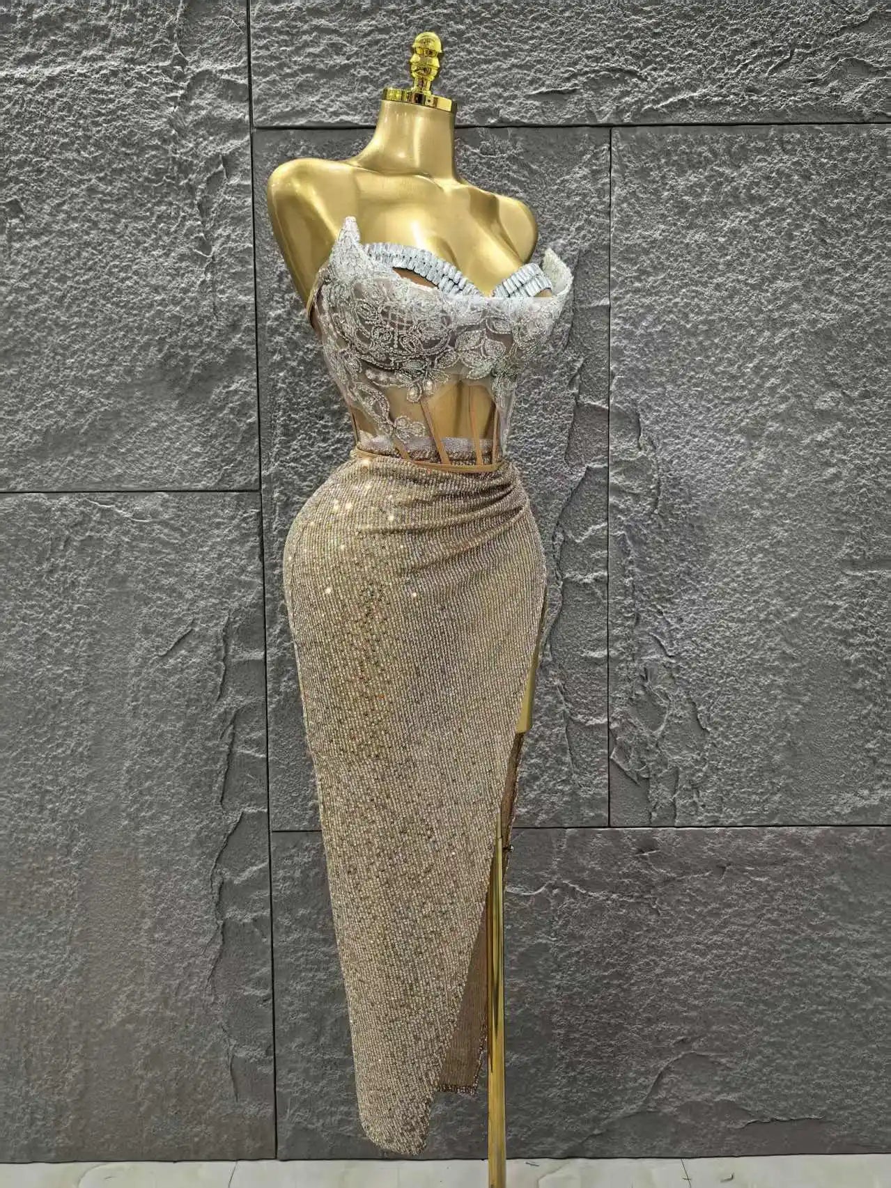 STOCK Women Sexy Strapless Shinning Crystal 2 Pieces Bodycon Mid-calf Dress Celebrate Bar Singer Performance Stage Wear