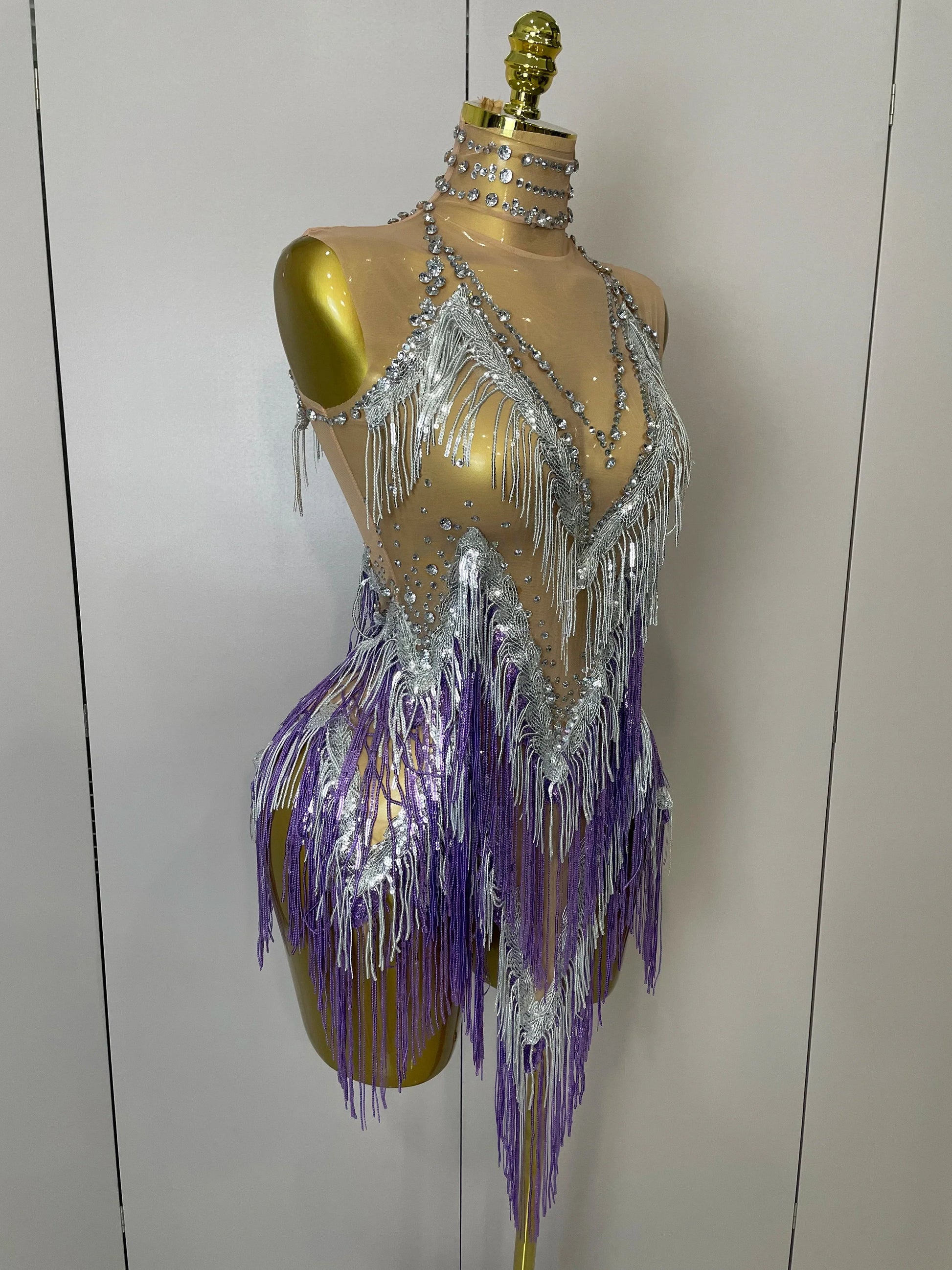 Women Sexy Stretch Mesh Sparkly Rhinestone Tassels Mini Dress Nightclub Singer Dance Stage Costume Evening Gowns