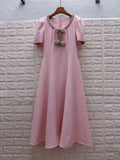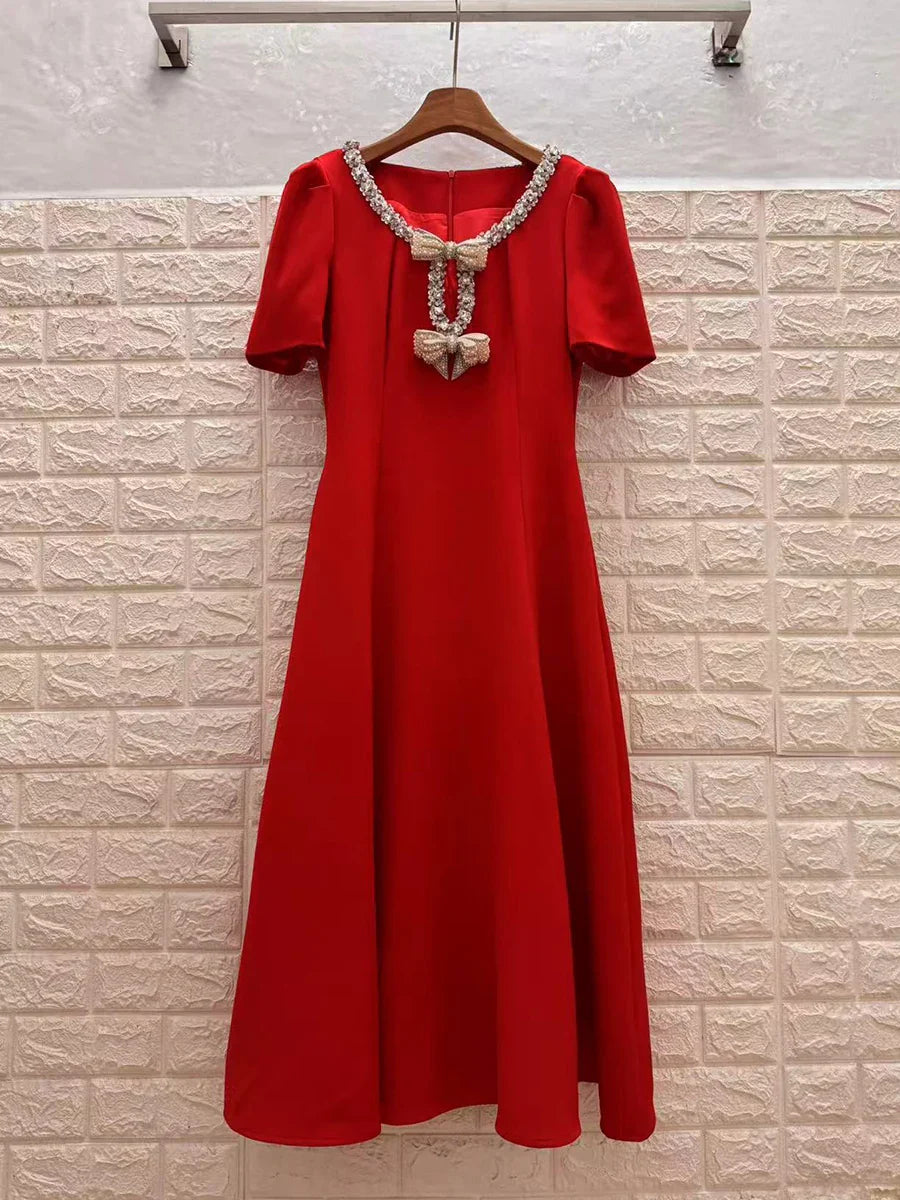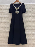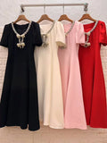 Solid Slimming Spliced Bowknot Elegant Dresses for Women Round Neck Short Sleeves Patchwork Bead Dress Female New