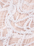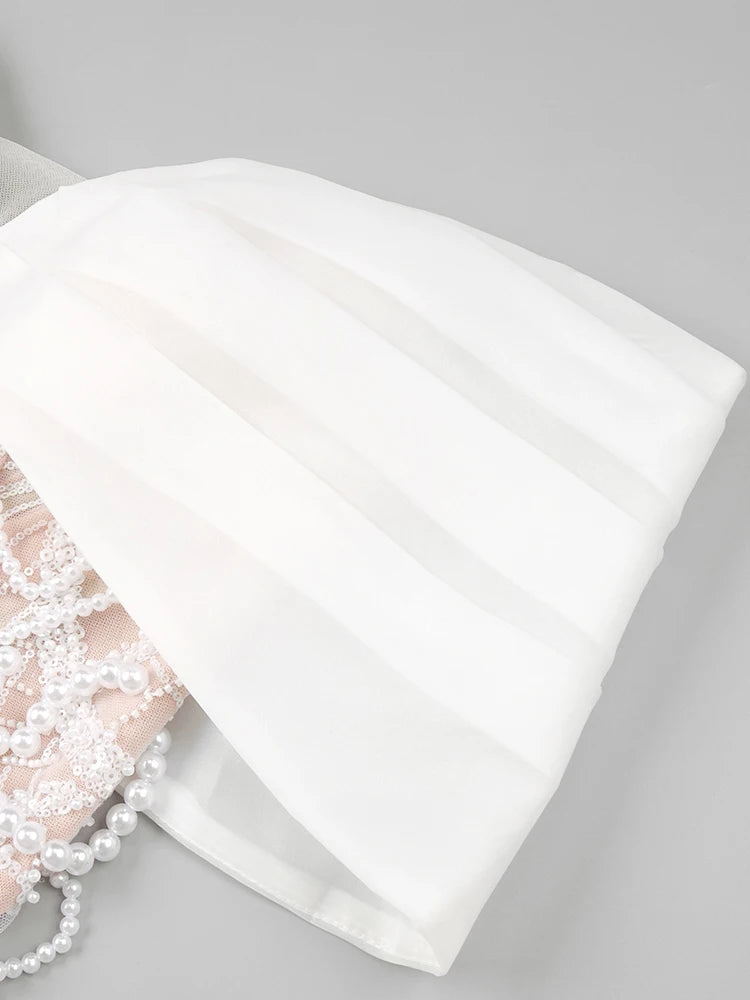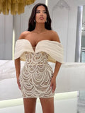 VC Beige Spilced Folds Short Dress Off The Shoulder Pearl Sequins Beading Chains Mini Cocktail Evening Party Vestido
