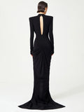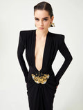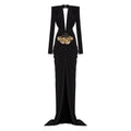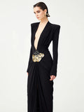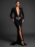 VC Black Deep V Plunge Long Dress Bead Sequins Butterfly Details Long Sleeves Slim High Slit Pleated Bodycon Party Evening Gowns