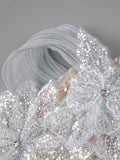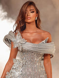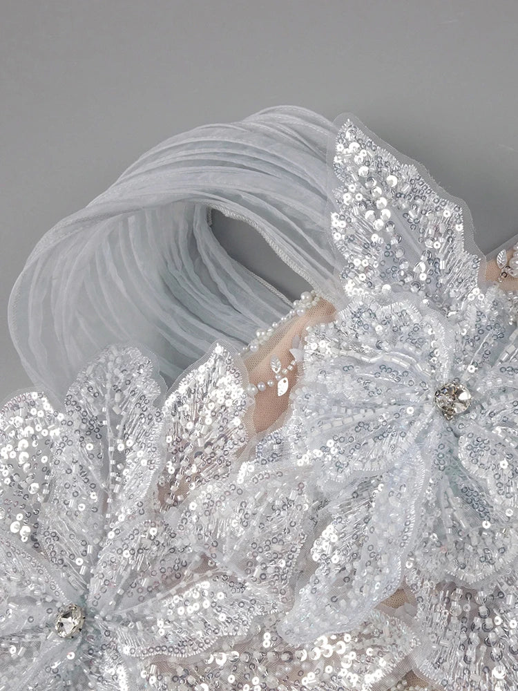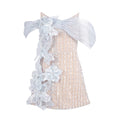 VC Dreamy Beige 3D Floral Sequin Pearl Design Off Shoulder Strapless Mini Dress for Party Evening Gown