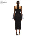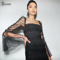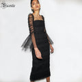 VC Dress Women Polka Dot Draped Mesh Sequined Mesh Long-sleeved Square Neck Halter Black Mid-length Bandage Midi Dress Gown