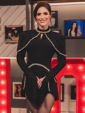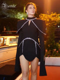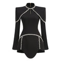 VC Elegant Black Long Sleeved Bodycon Mini Dress with Crystal Adorned Seams for a Special Event Gown