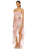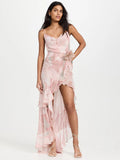 VC Floral-Print Ruffled Long Dress Pink Color Cowl Neck Spaghetti Straps Pleated Hem Strapless Maxi Cocktail Party Evening Gowns