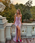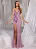 VC Pink Strapless Mermaid Long Dress Pearls Beaded Structured Flower Detail High Split Mesh Patchwork Bodycon Party Evening Gown