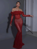 VC Red Structured Flower Boned Bodice Christmas Long Dress For Women Long Sleeves Sequins Mermaid Party Evening Gown
