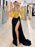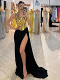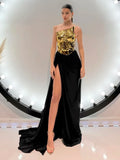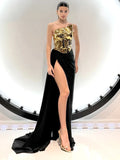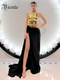 VC Sexy Backless Long Skirt 2 Pieces Set Women Strapless Golden Ruched Lace Up Top with Black High Slit Maxi Skirt Party Suits