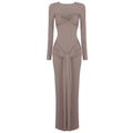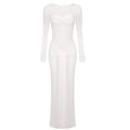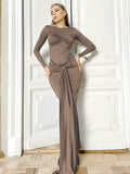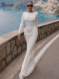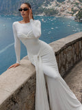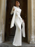 VC Solid Ruched Long Flare Sleeves Maxi Dress Elegant White Tie Waist High Neck Pleated Draped Backless Party Evening Dress