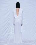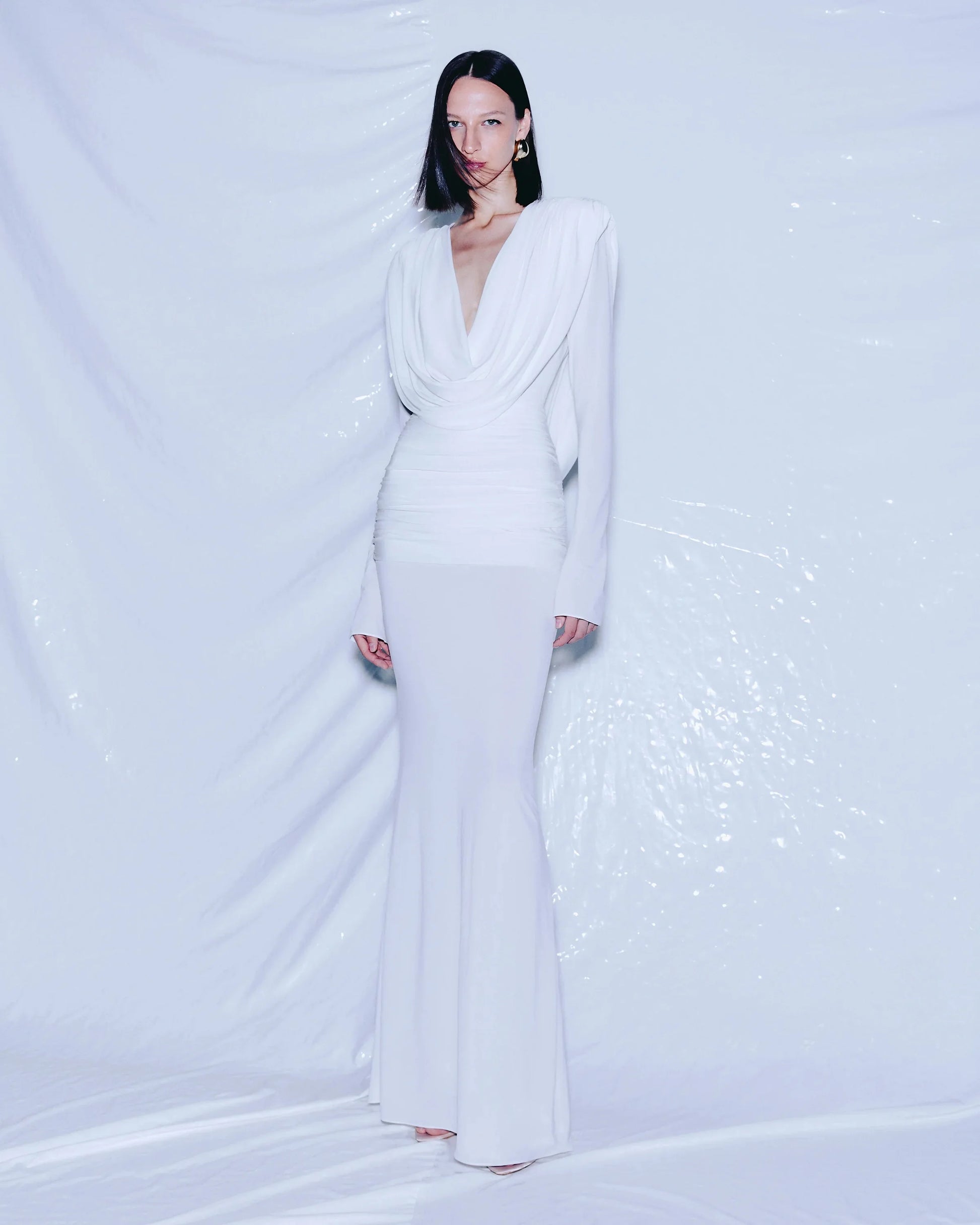 White Color Women Long Sleeve Sexy V-Neck Draped Bodycon Long Dress Fashion Celebrate Evening Party Birthday Outfit