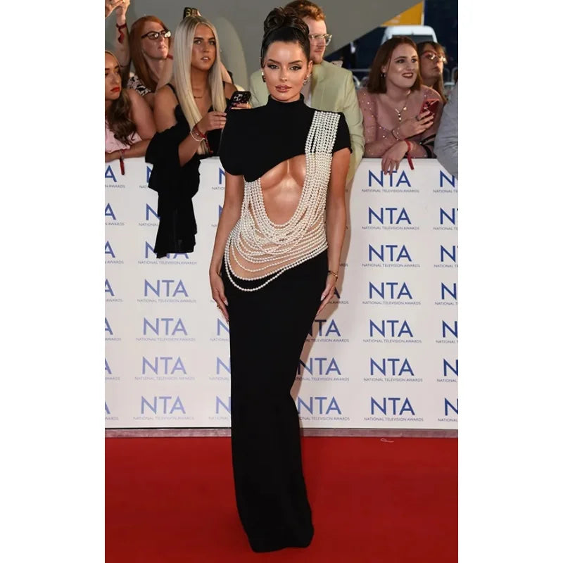 2025 Luxury Pearl Geometric Design strapless Package Hips Bandage Long Dress Elegant Woman Party Dress Celebrity Party Vestido