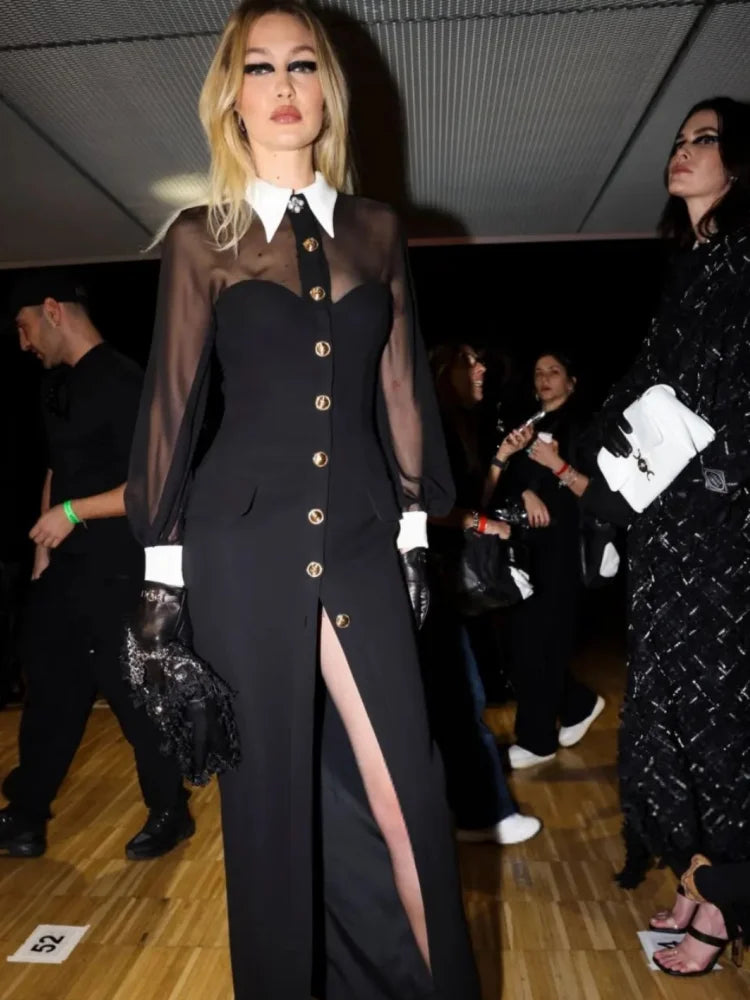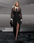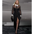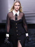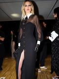 2024 New Golden Buttons White Collar Mesh Patchwork Bandage Long Dress Elegant Woman Evening Party Dress Fashion Party Outfit