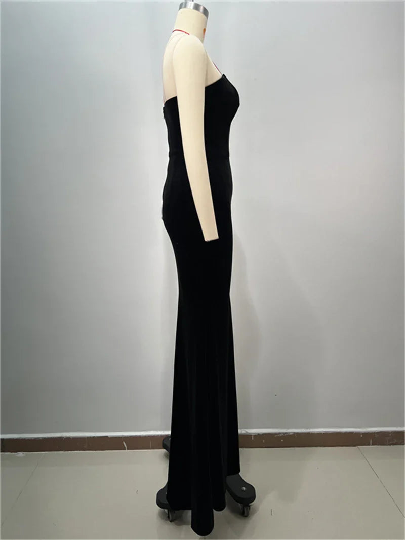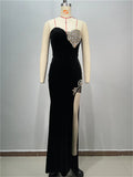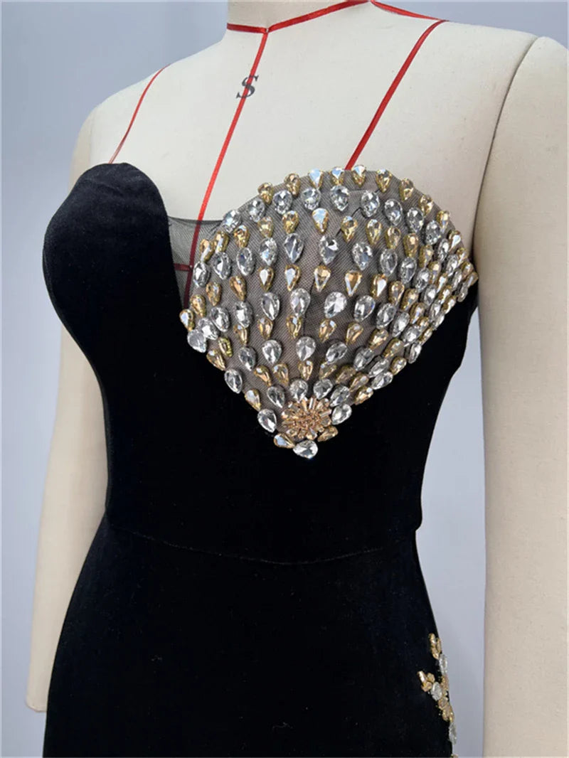2025 Luxury Shining Diamonds Sexy High Slit Stapless black velvet Long Dress Elegant Woman Birthday Party Dress Goddess Vestido