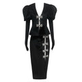 2025 New Fashion Gloves Black Velvet Woman Set Shining Diamond Bows V-Neck Jacket Sexy Hollow out package Hips Skirt Set 2 Piece