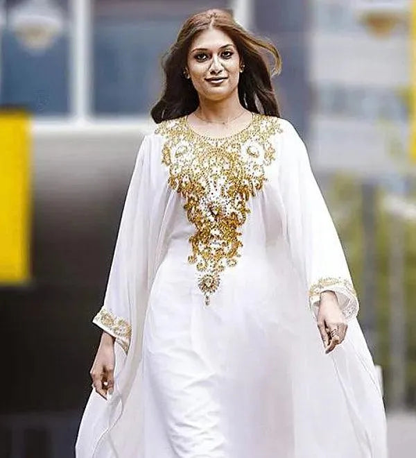 Abiti da sera musulmani in chiffon bianco con paillettes dorate e perline Dubai Marocchino Kaftan Abiti da donna Abaya Abito da ballo formale per feste