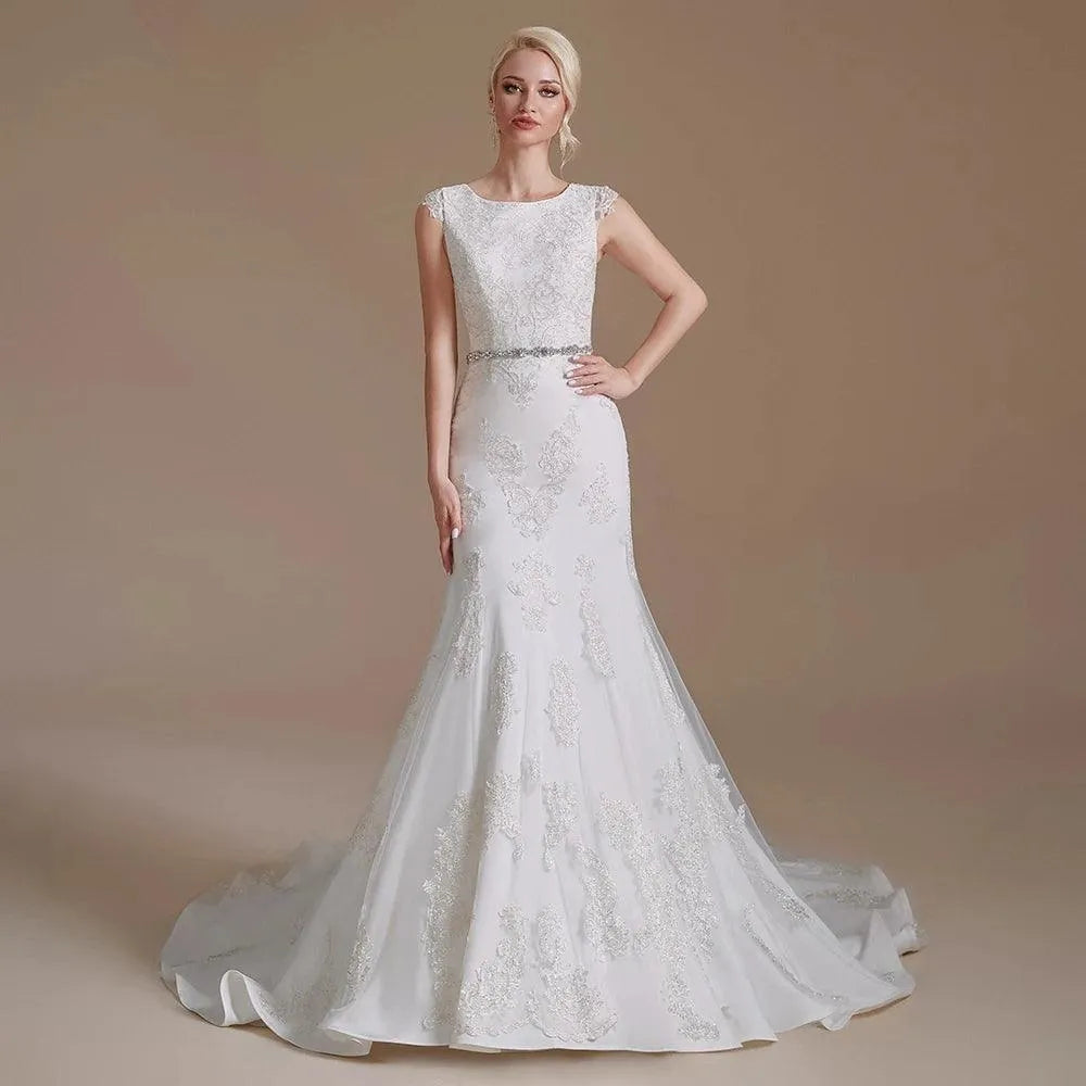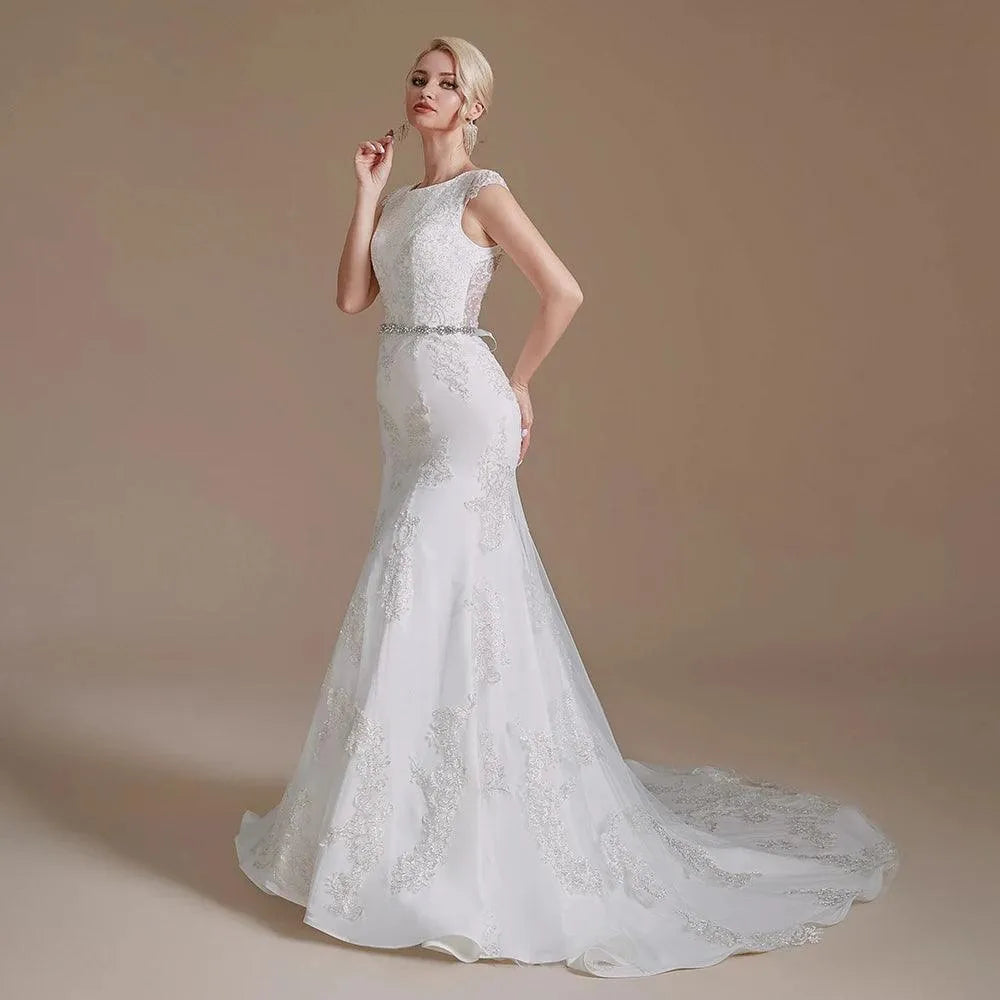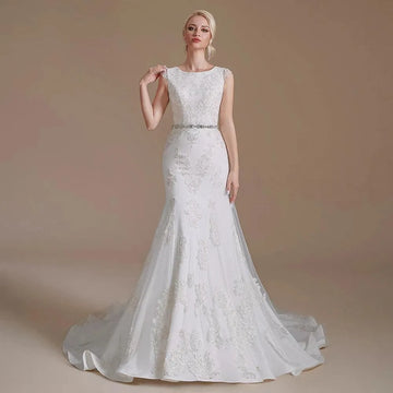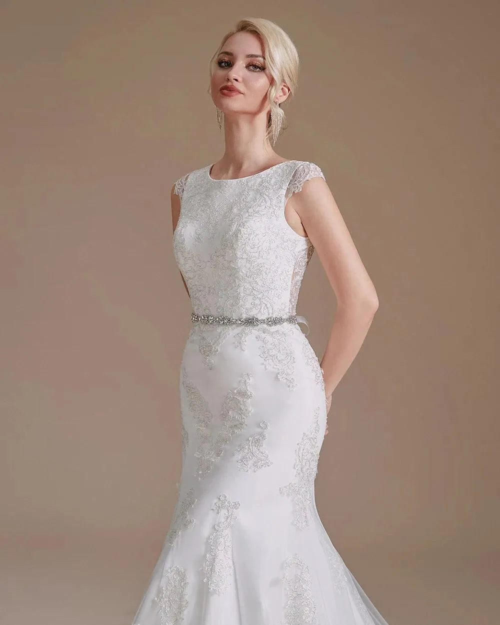 Abito da sposa in pizzo di lusso personalizzato, splendido abito da sposa con cintura in strass e maniche a cappuccio a sirena, con schiena trasparente