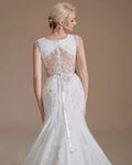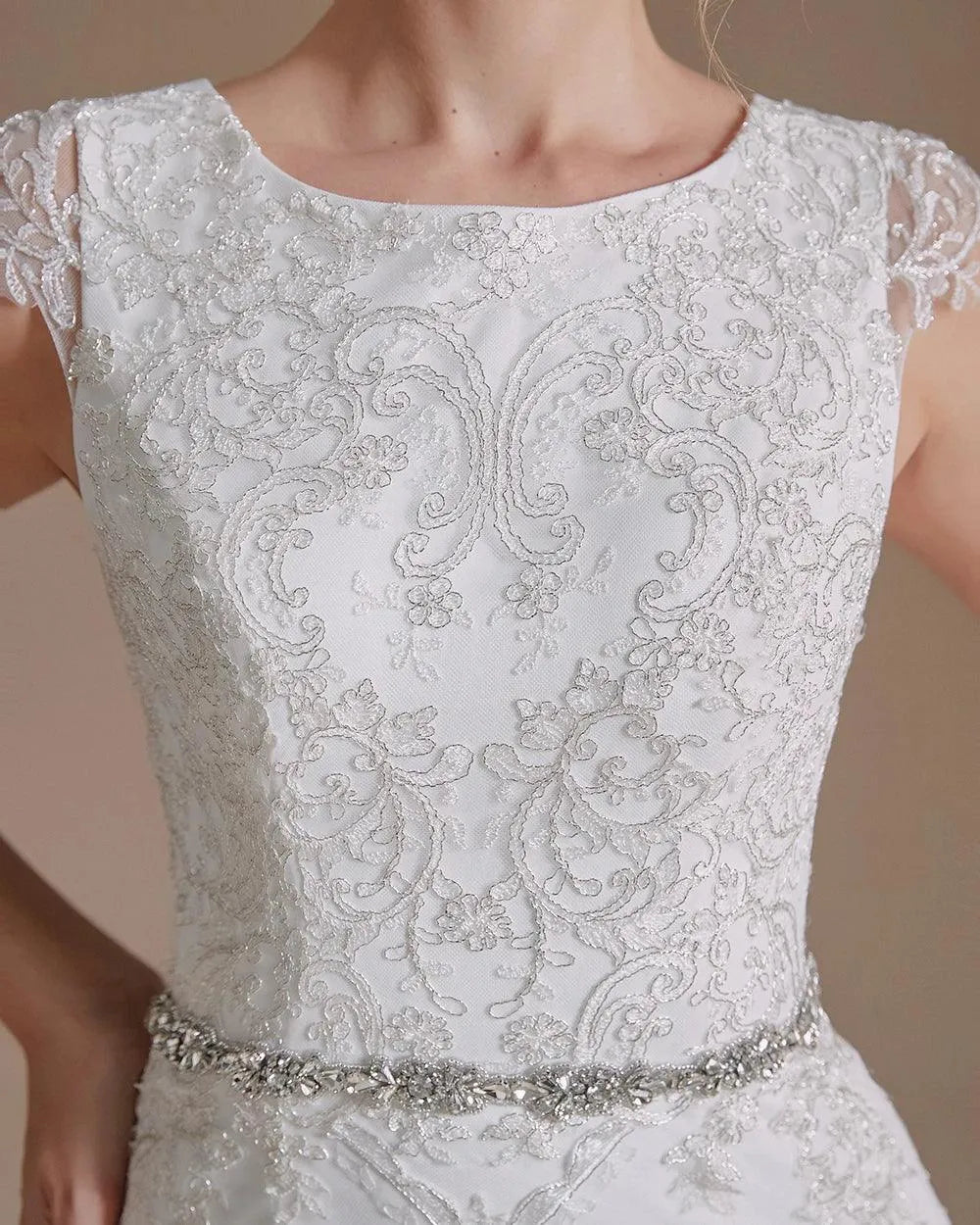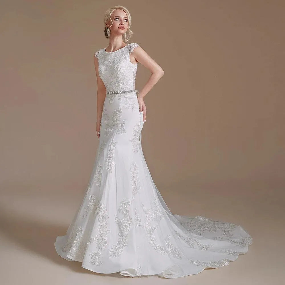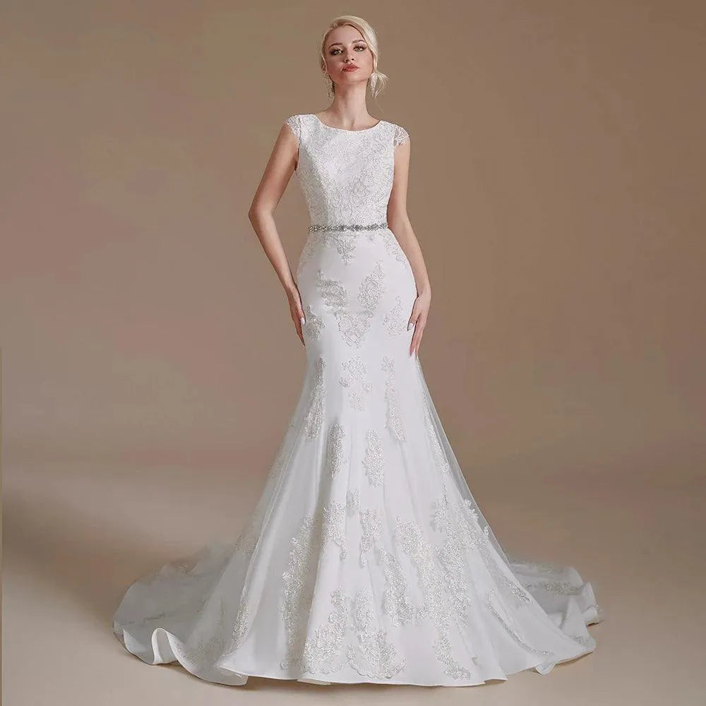 Abito da sposa in pizzo di lusso personalizzato, splendido abito da sposa con cintura in strass e maniche a cappuccio a sirena, con schiena trasparente