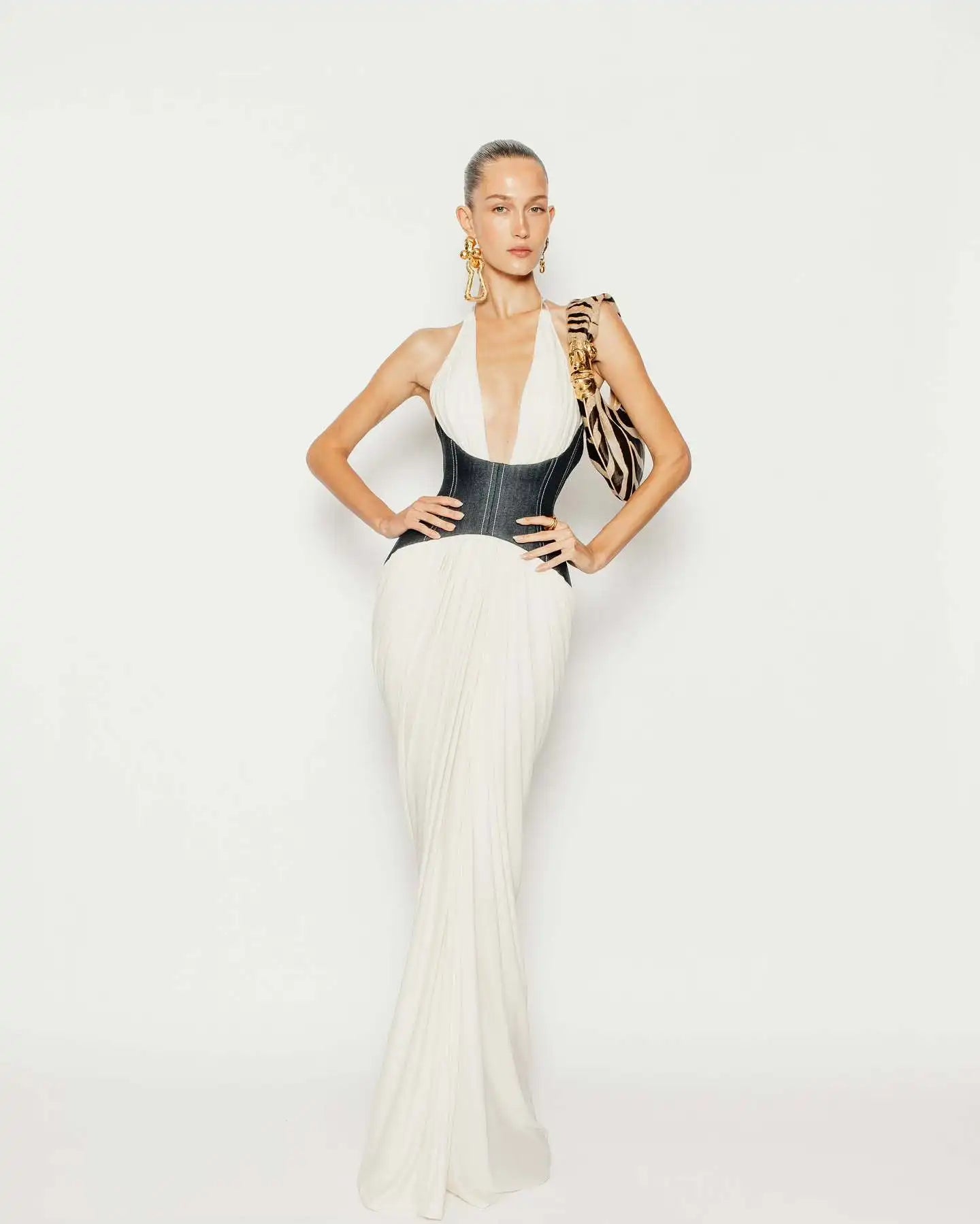 Denim Waistband Patchwork Sexy V-Neck Halter Mermaid Floor Length Dress Fashion Woman Party Dress Holiday Vocation Outfit
