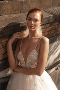 Elegante abito da sposa con scollo a V, spalline a trapezio, applicazioni in pizzo, abiti da sposa senza maniche
