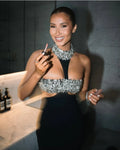 Luxury Shining Diamonds Sexy Hollow Out Halter Sheath Black Ankle Length Dress Party Dress Celebrity Birthday Vestido