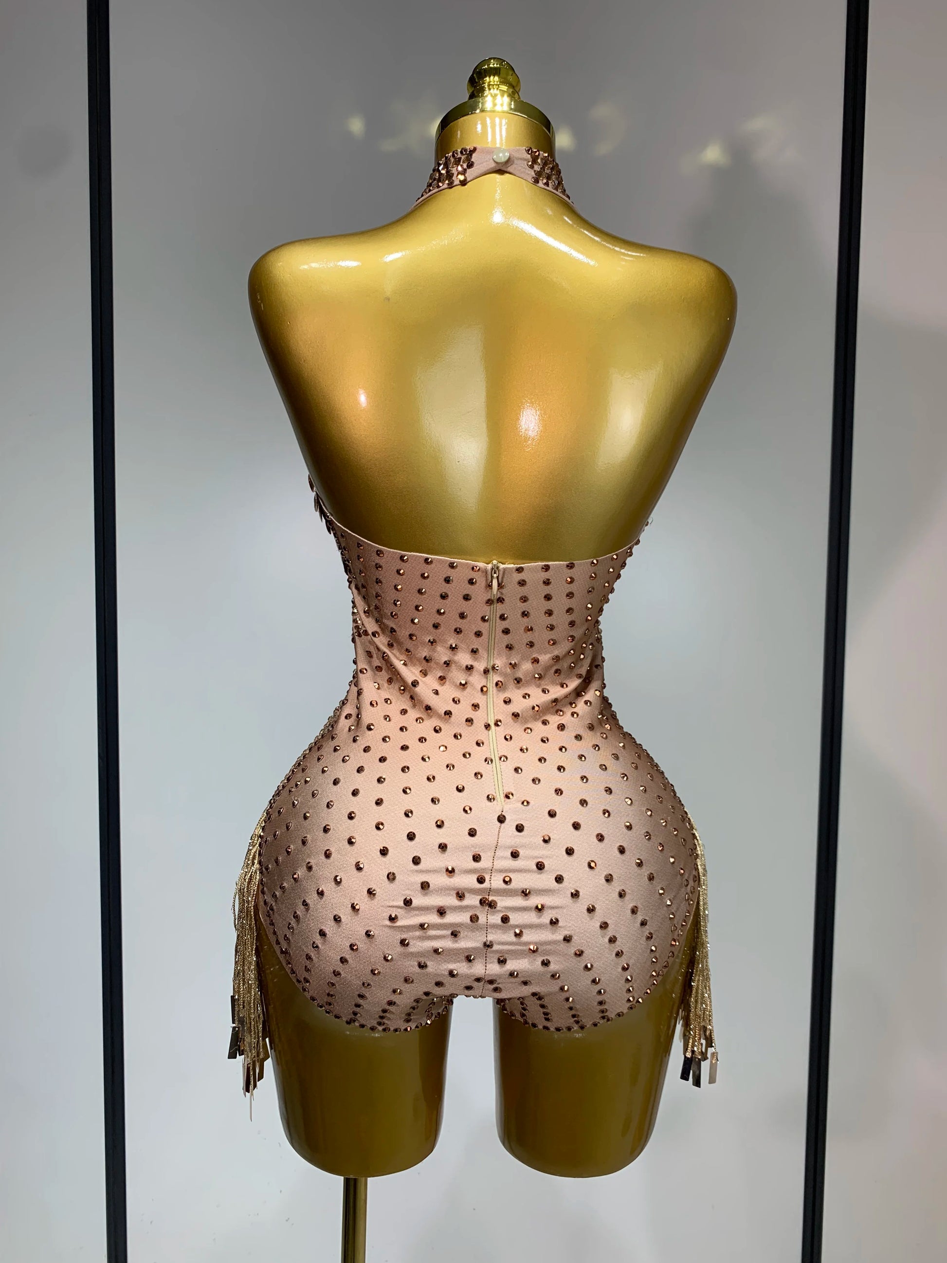 Luxury Sparkly Rhinestones Tassels Sequins Bodysuit Women Sexy Halter Backless Stage Performance Costume Club Birthday Outfit