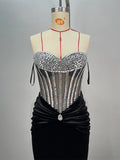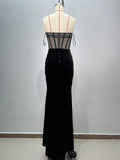 New Luxury Diamonds Sexy Mesh See Through Black Velvet Strapless Floor Length Dress Celebrity Party Dress Birthday Vestido