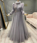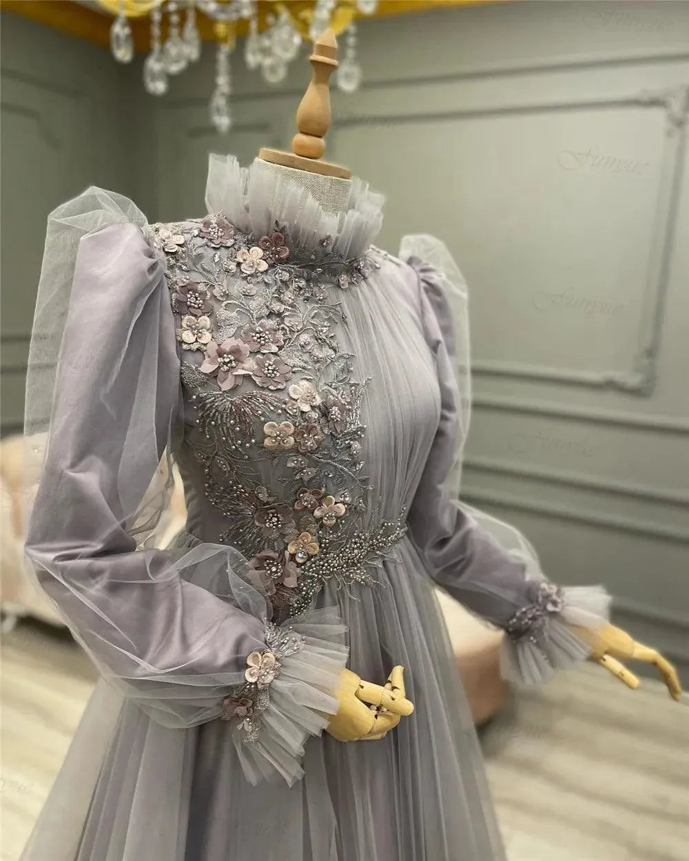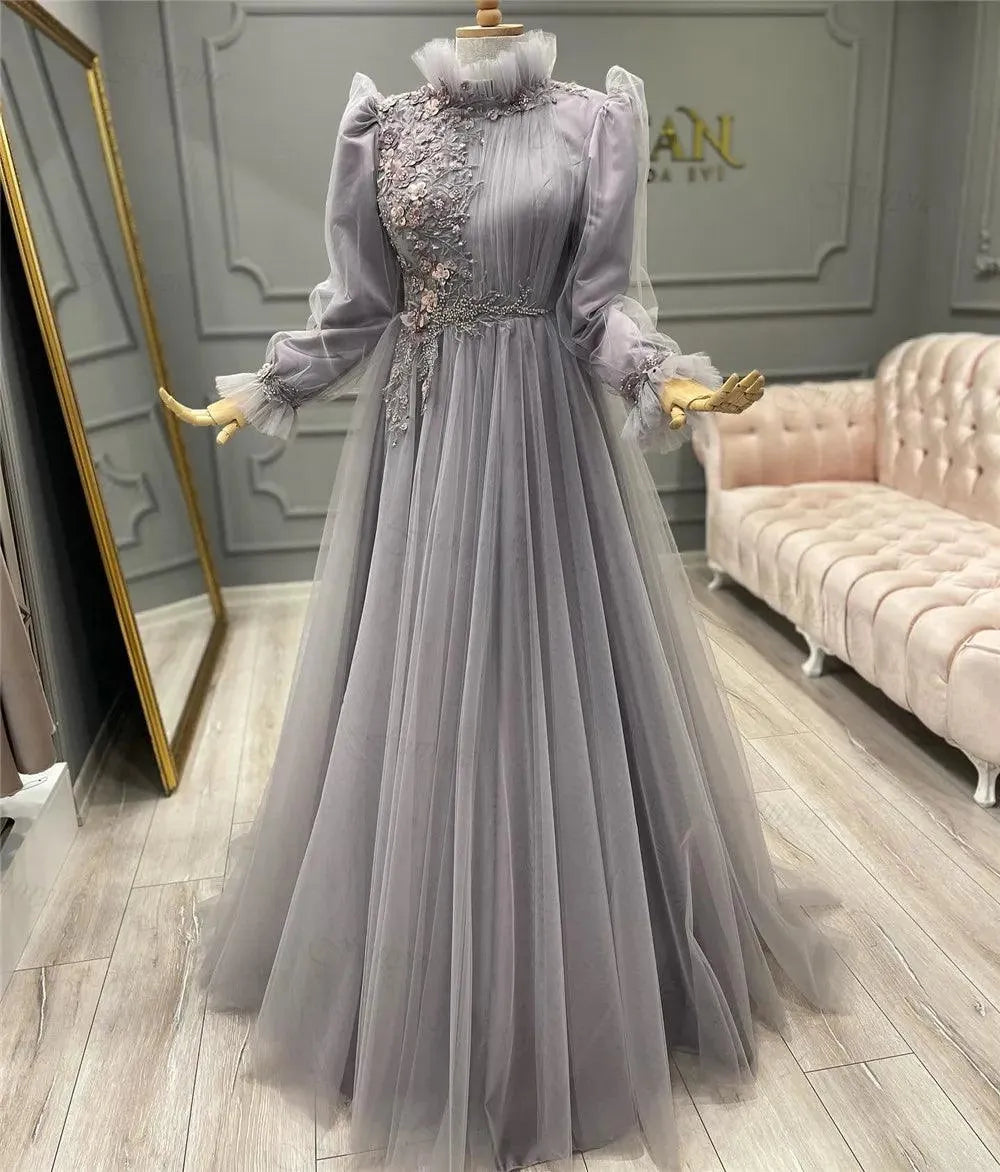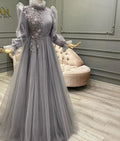 Robes De Soirée A-Line Prom Dresses per le donne Arabo Maniche Lunghe Abito Formale Fiori Perline Abiti da Sera Musulmani