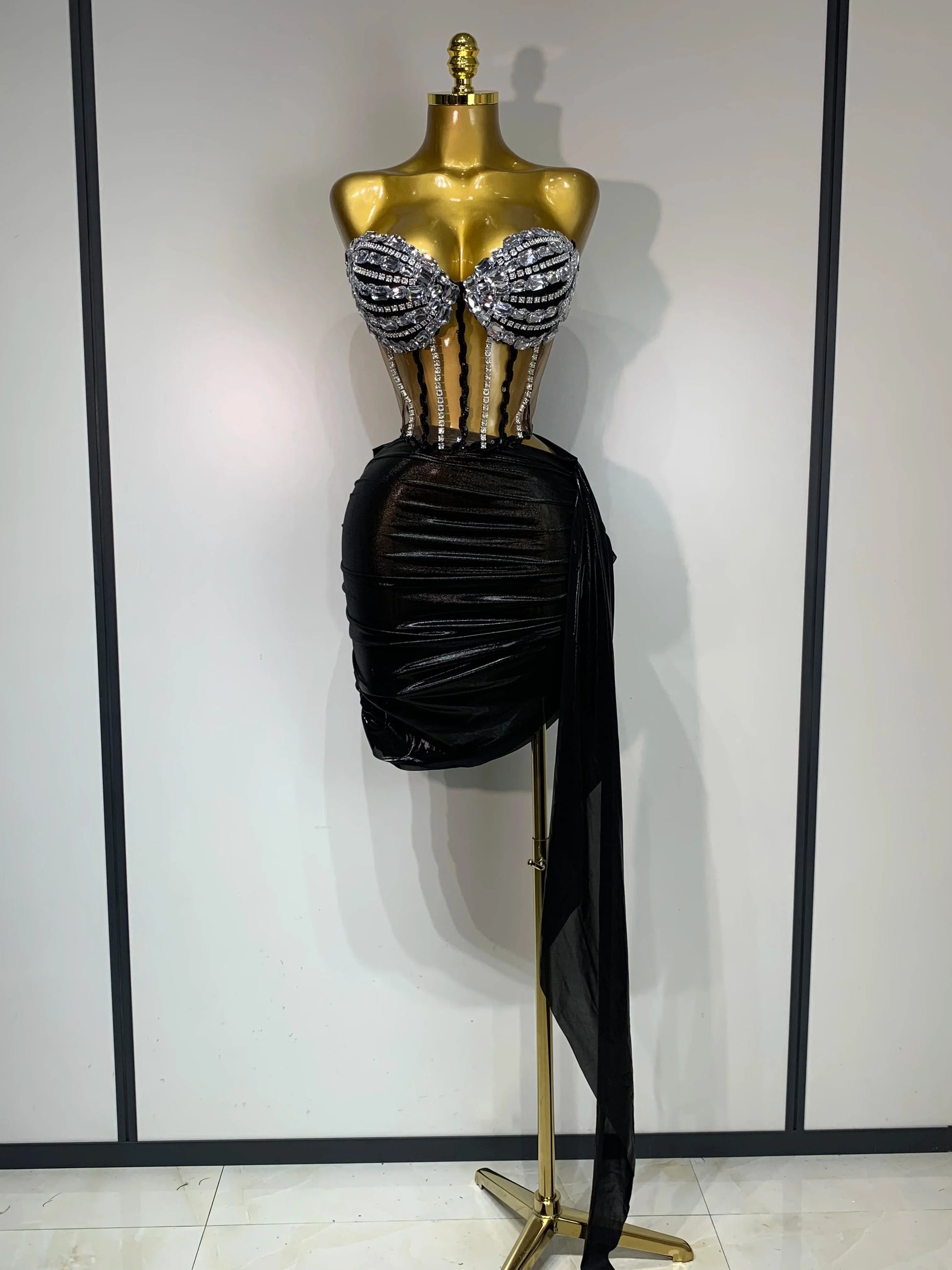 Sexy Two Pieces Top Skirt Sets Sparkly Diamonds See Through Stage Outfit Designer Performance Party Nightclub Birthday Dress