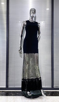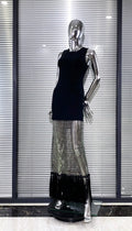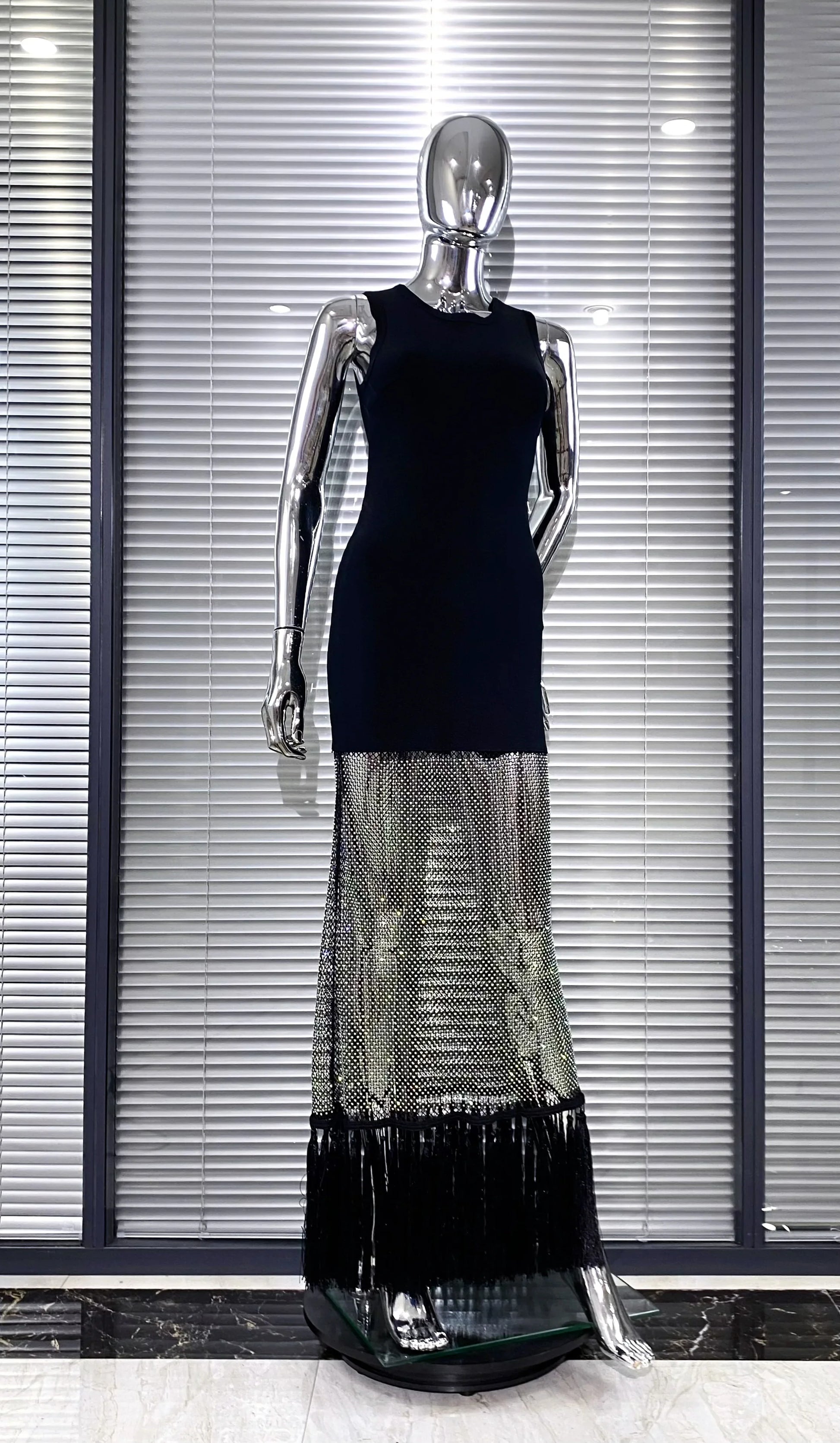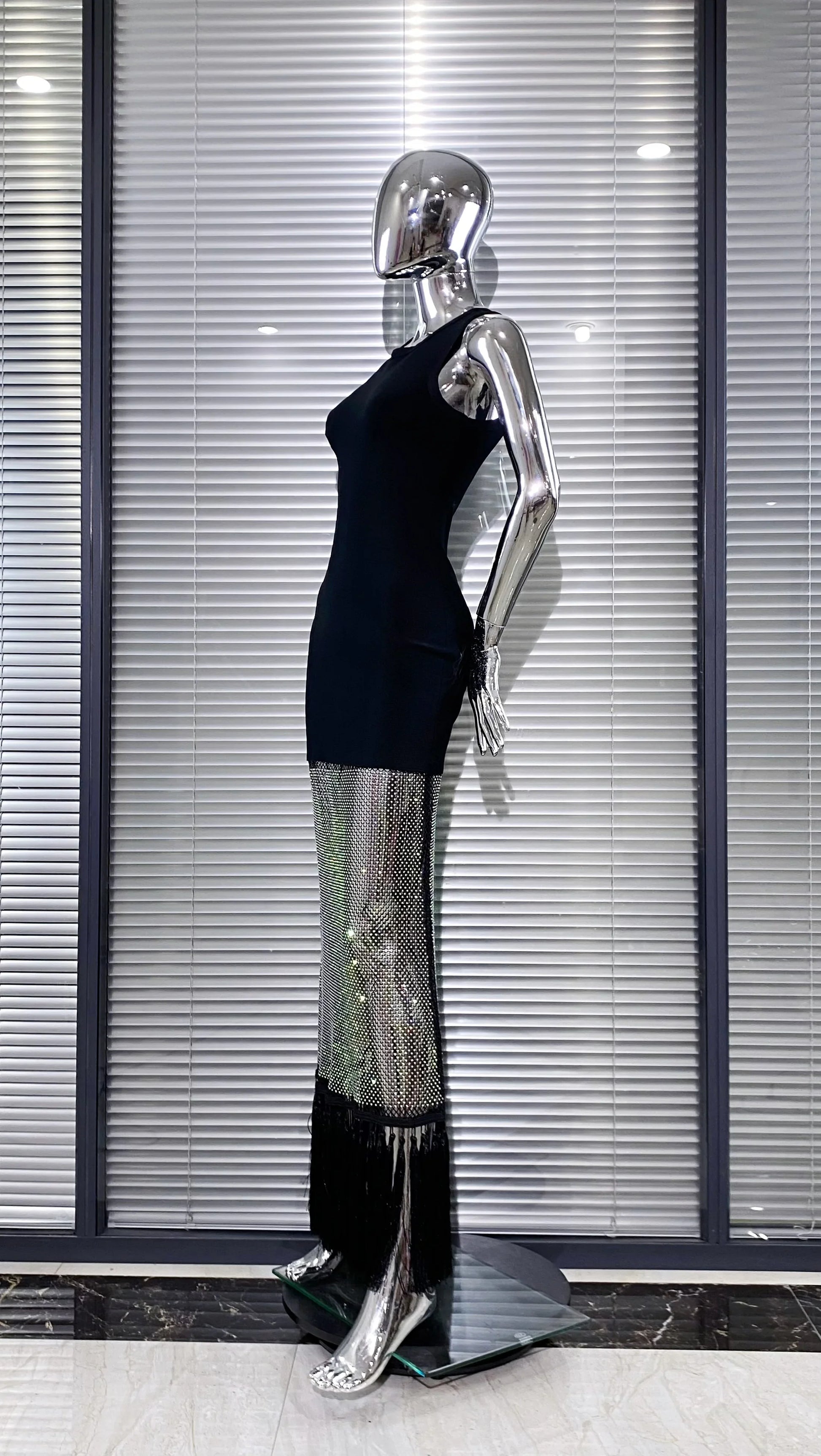 Shining Diamond See Through Mesh Tassels Black Bandage Ankle Length Dress Fashion Woman Party Dress Birthday Party Outfit