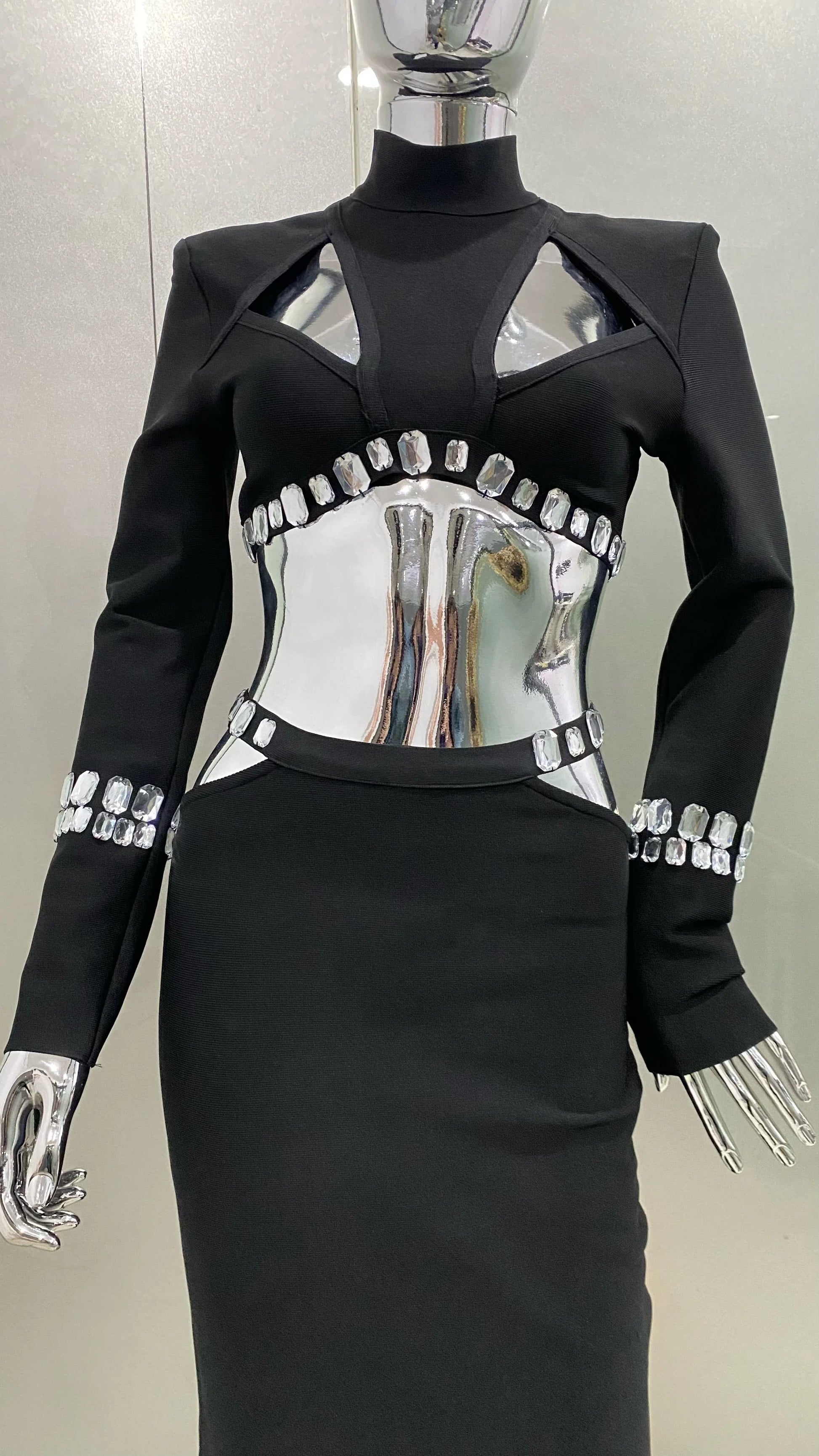 STOCK Stylish Luxury Diamonds Woman Bandage Set Sexy Hollow Out Short Top And Mermaid Long Skirt 2 Pieces Evening Party Vestido
