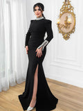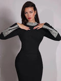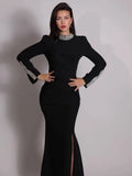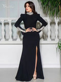 VC Black Long Sleeves Diamonds Turle Neck Dress Long Sleeves High Slit Celebrity Cocktail Party Bandage Long Dress Maxi Gowns