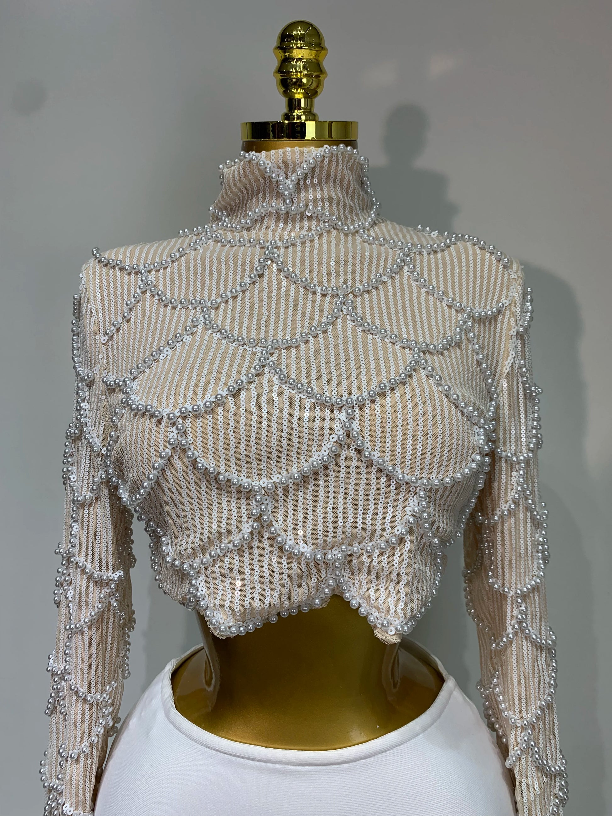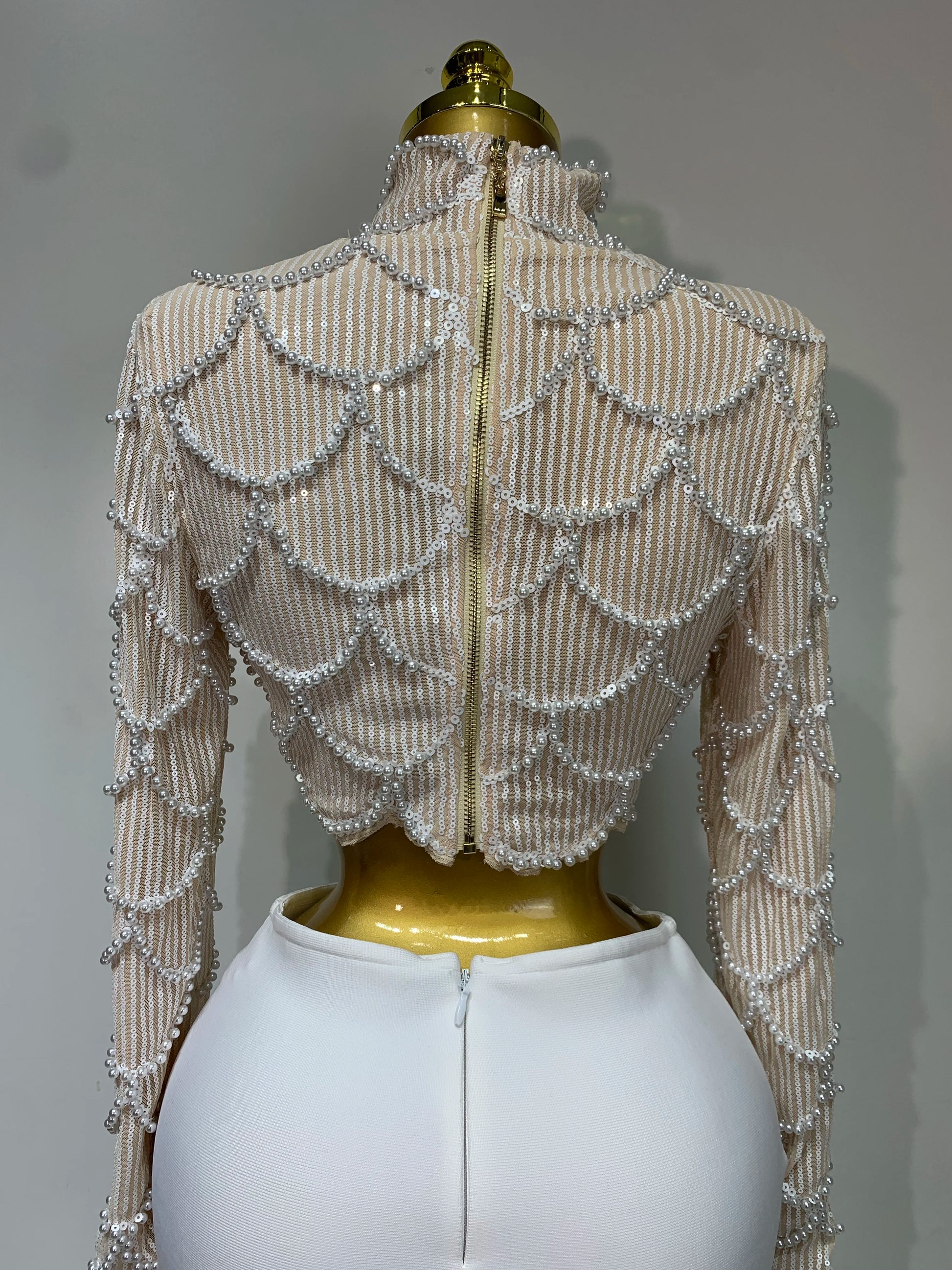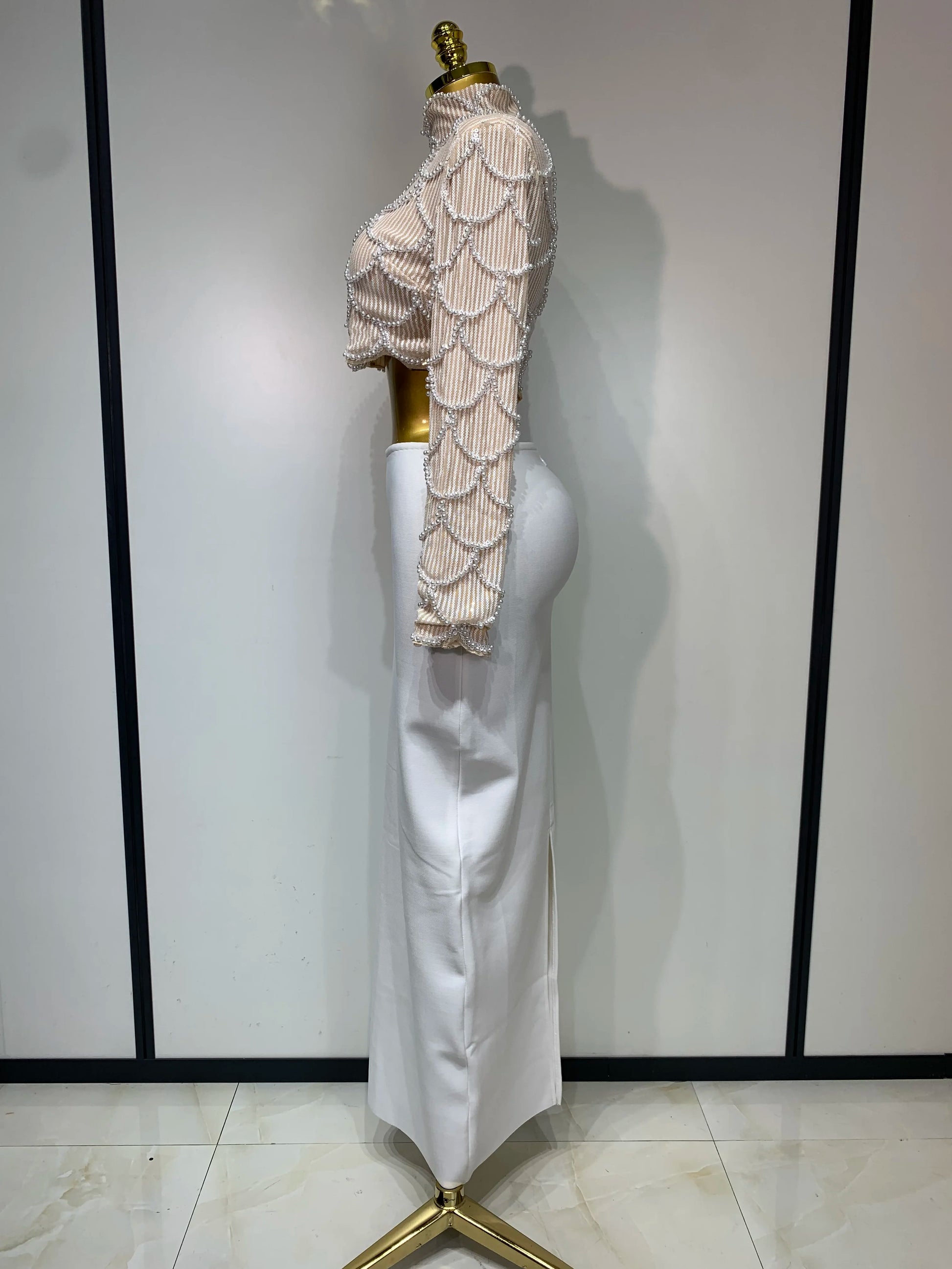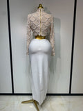 Women Long Sleeve Sexy Beading Tops Two Pieces Set Bodycon Long Bandage Dress Luxury Birthday Evening Party Wedding Guest Gowns