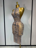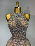 Women Sexy Backless Mesh Crystal Diamonds Performance Costume Stage Dancer See Through Stretchy Nightclub Evenig Party Dresses