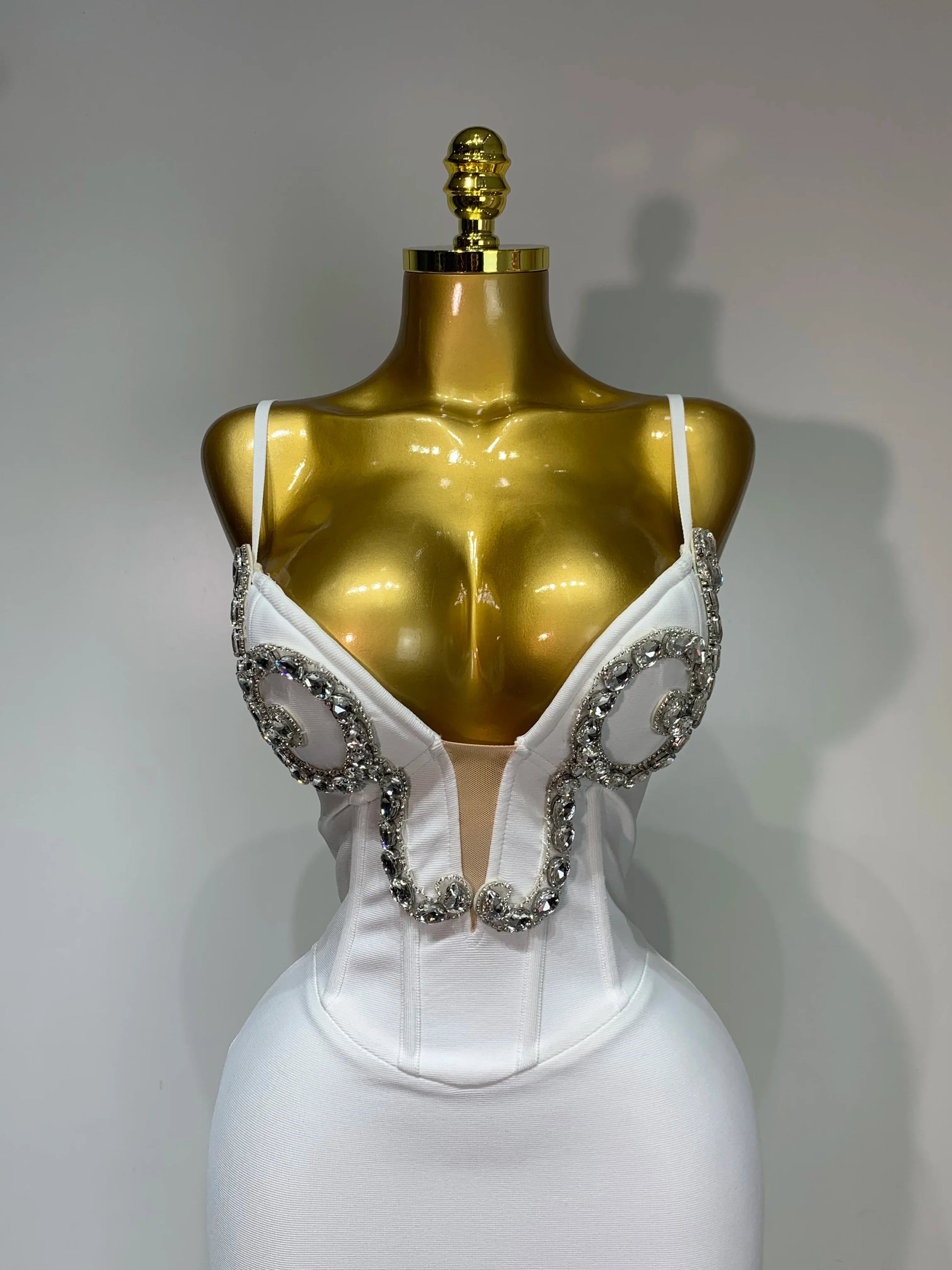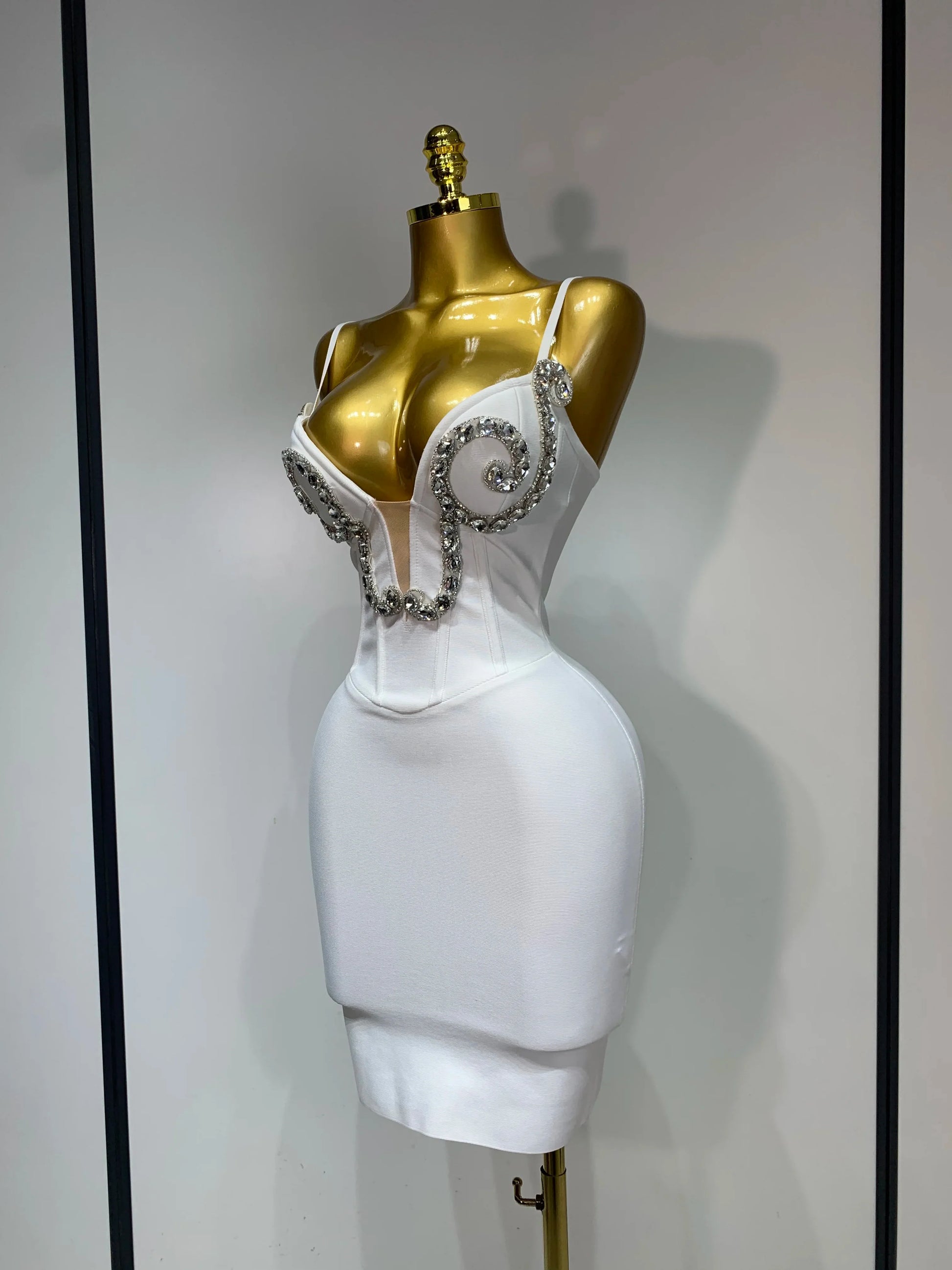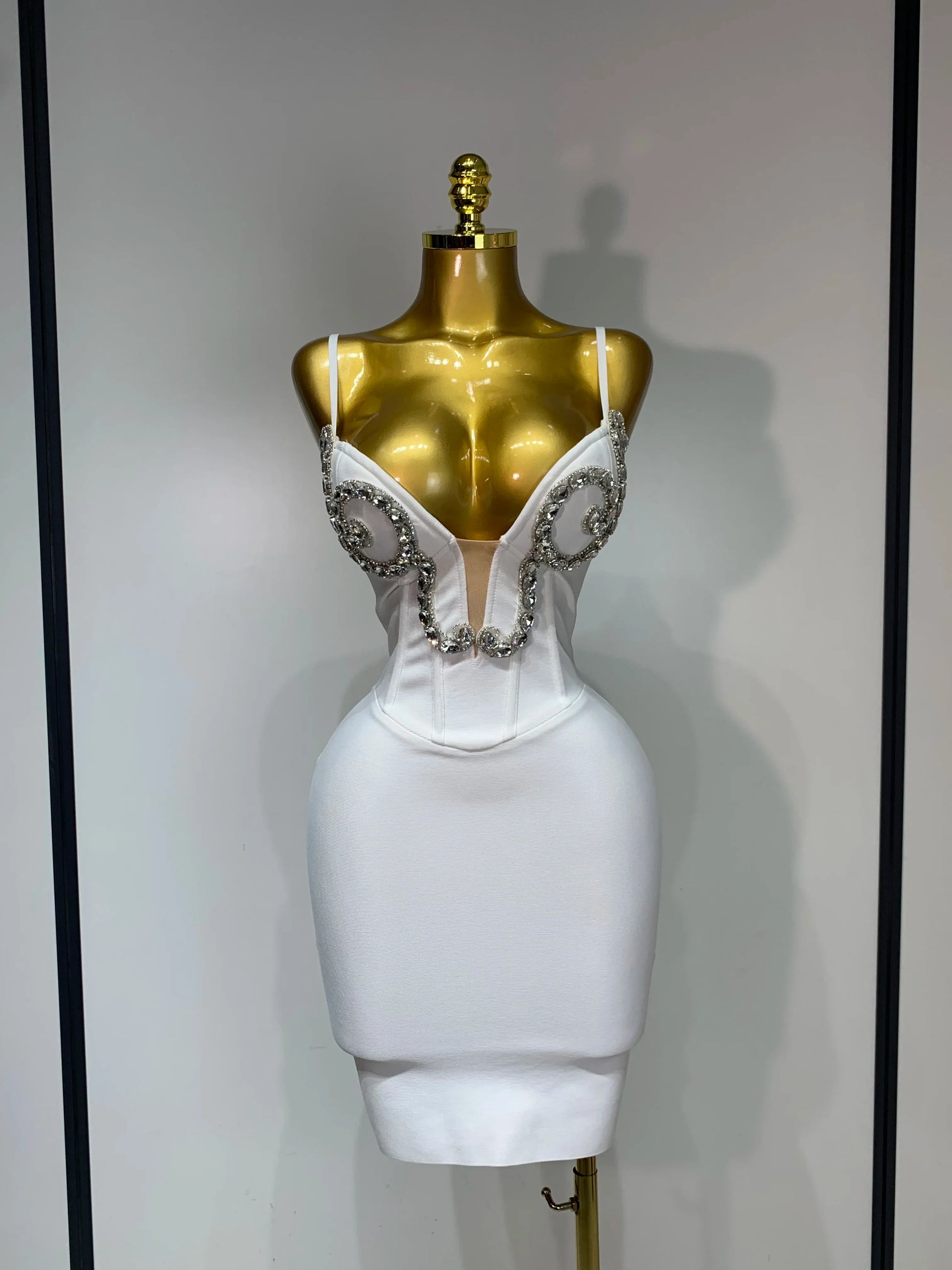 Women Sexy Spaghetti Strap V Neck Crystal Sleeveless Bandage Dress White Elegant Evening Party Cocktail Luxury Birthday Gowns